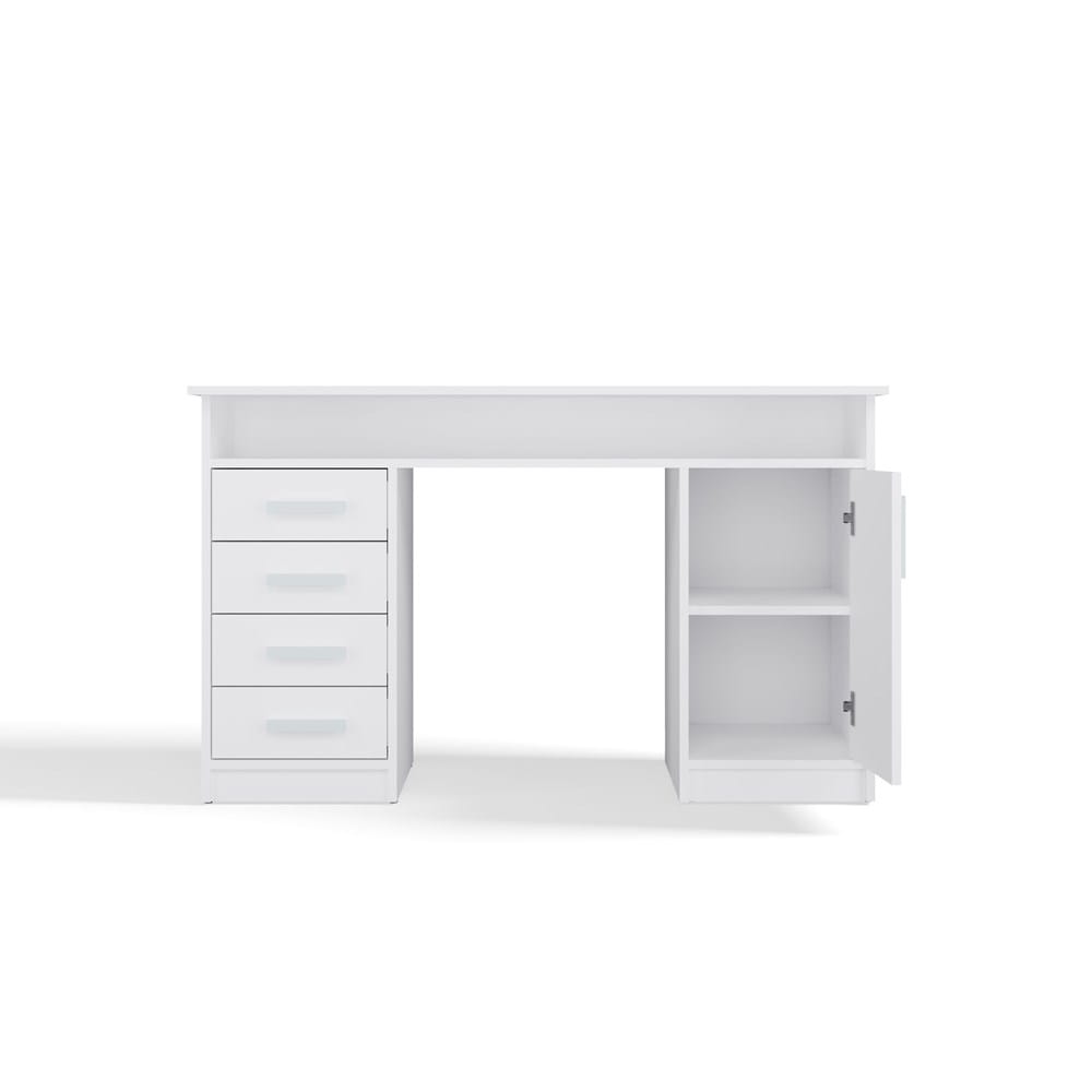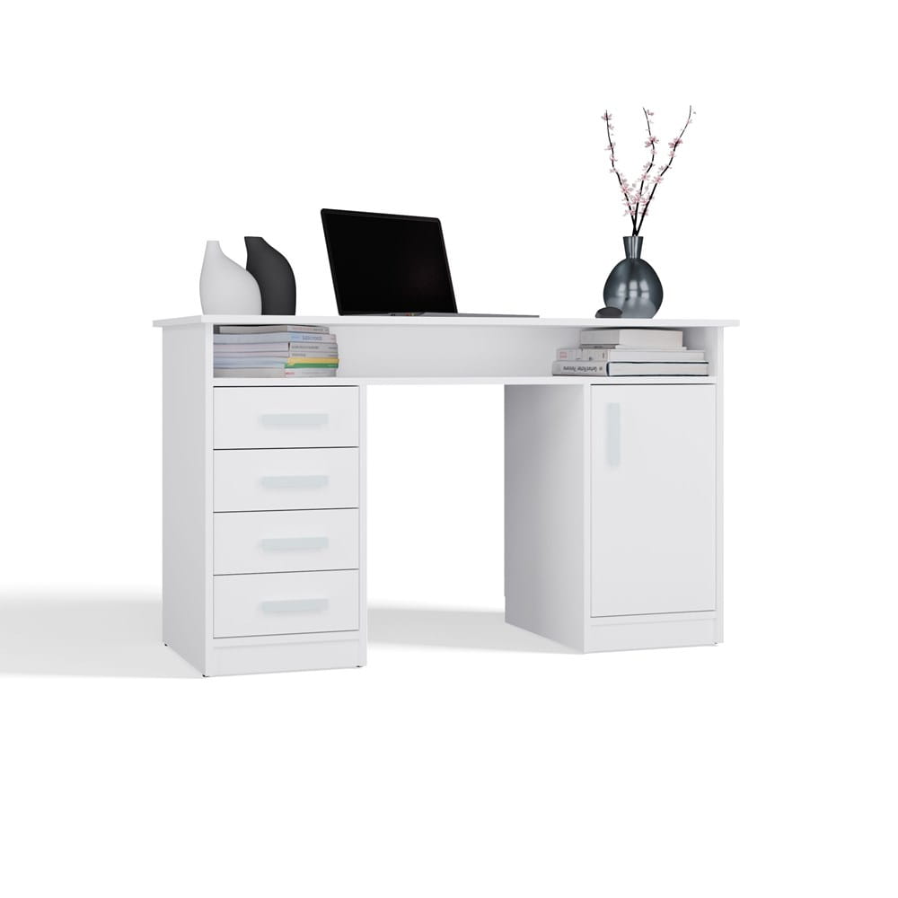 Model został wyposażony w cztery pojemne szuflady, zamykaną szafkę z półkami oraz dodatkową półkę pod blatem, która idealnie sprawdzi się na laptopa, książki czy przybory szkolne. Dzięki temu biurko zapewnia wygodę pracy i świetną organizację przestrzeni.