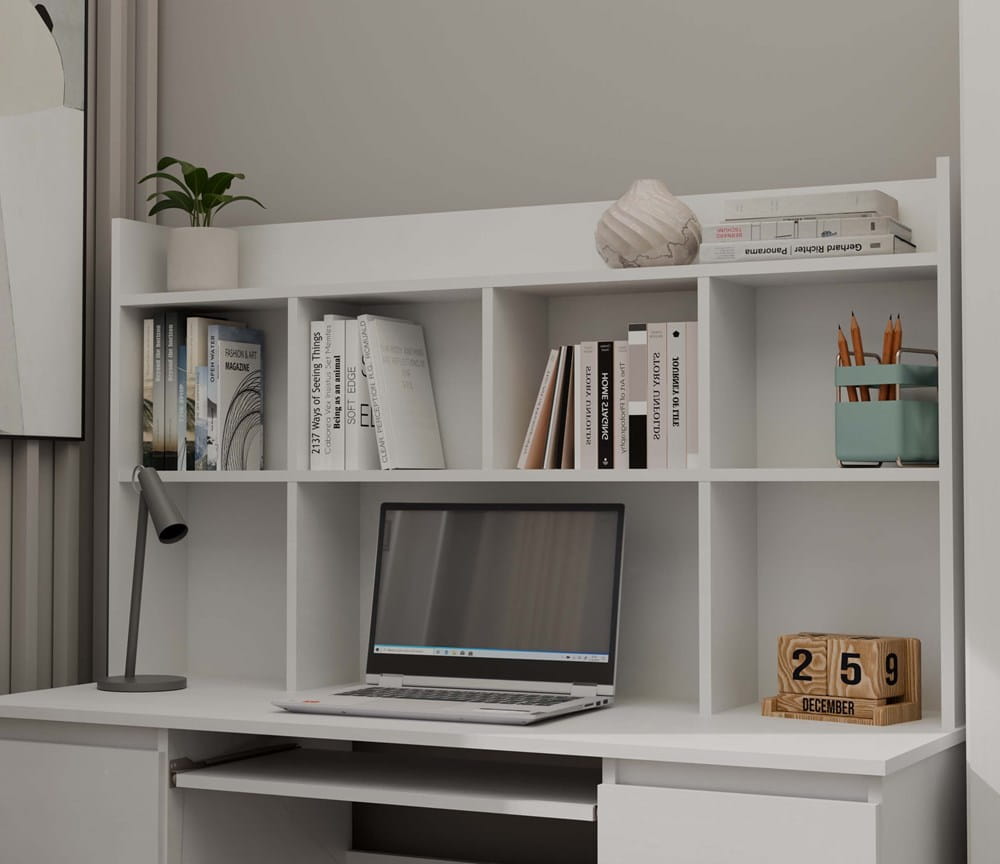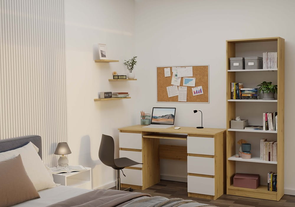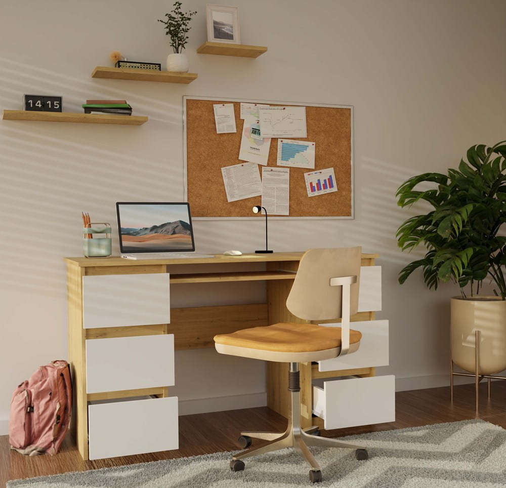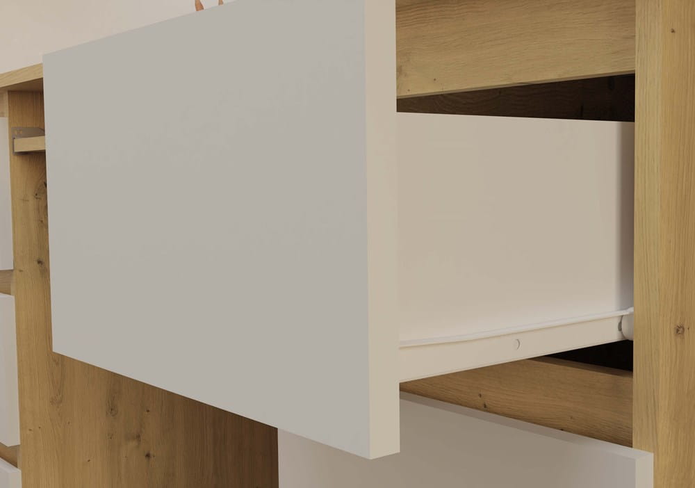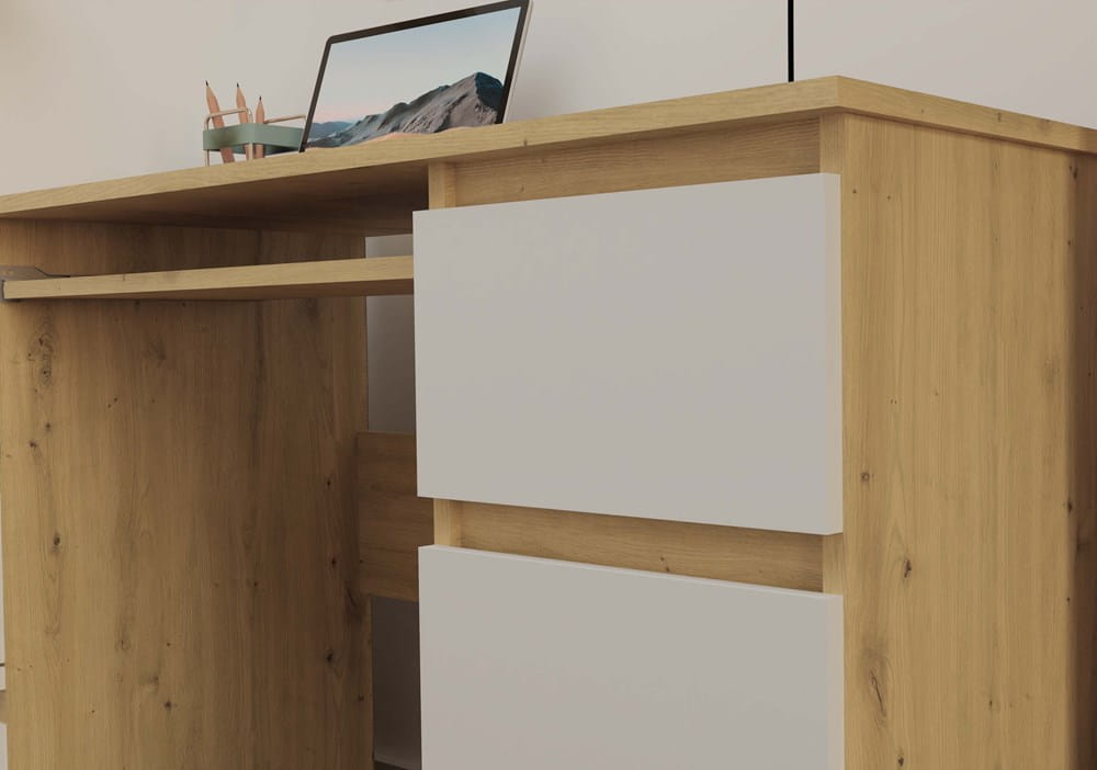 Minimalistyczna forma i połączenie kolorów dąb artisan z białym frontem nadają biurku nowoczesny, a zarazem uniwersalny charakter – pasujący do każdego wnętrza.