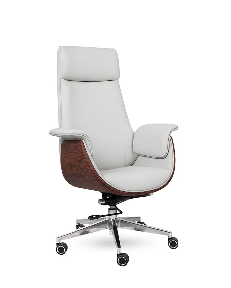 Tapicerowany wysokiej jakości skórą ekologiczną, fotel zachwyca profilowanym oparciem z zagłówkiem oraz dekoracyjnym wykończeniem w stylu drewna. Metalowa podstawa zapewnia stabilność i umożliwia swobodny obrót.