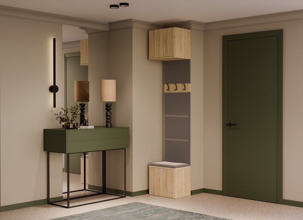 HAGA 1W to funkcjonalny wieszak do przedpokoju, który łączy wygodne siedzisko, miejsce do przechowywania, panel z haczykami oraz praktyczną szafkę górną. Dzięki kompaktowej formie świetnie sprawdza się zarówno w małych przedpokojach, jak i w większych holach.