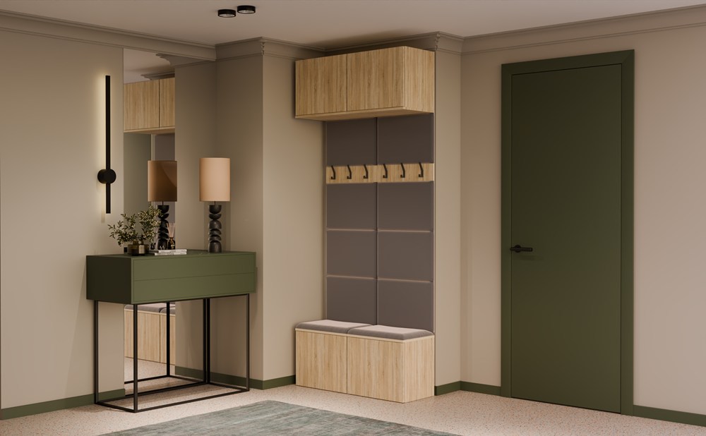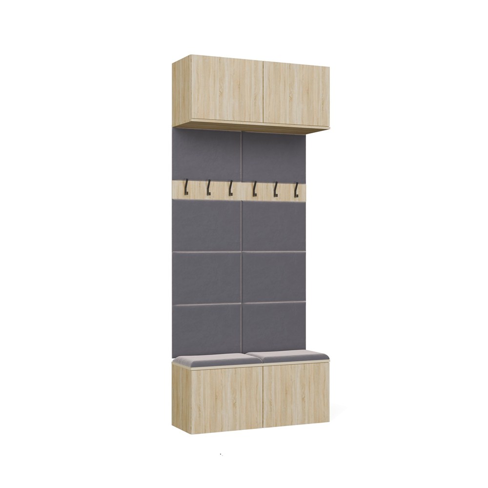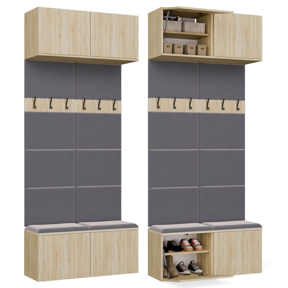 Model został zaprojektowany z myślą o uporządkowanej i estetycznej przestrzeni wejściowej – oferuje szafki dolne, wygodne siedzisko z miejscem do przechowywania, praktyczne panele z wieszakami oraz szafki górne.