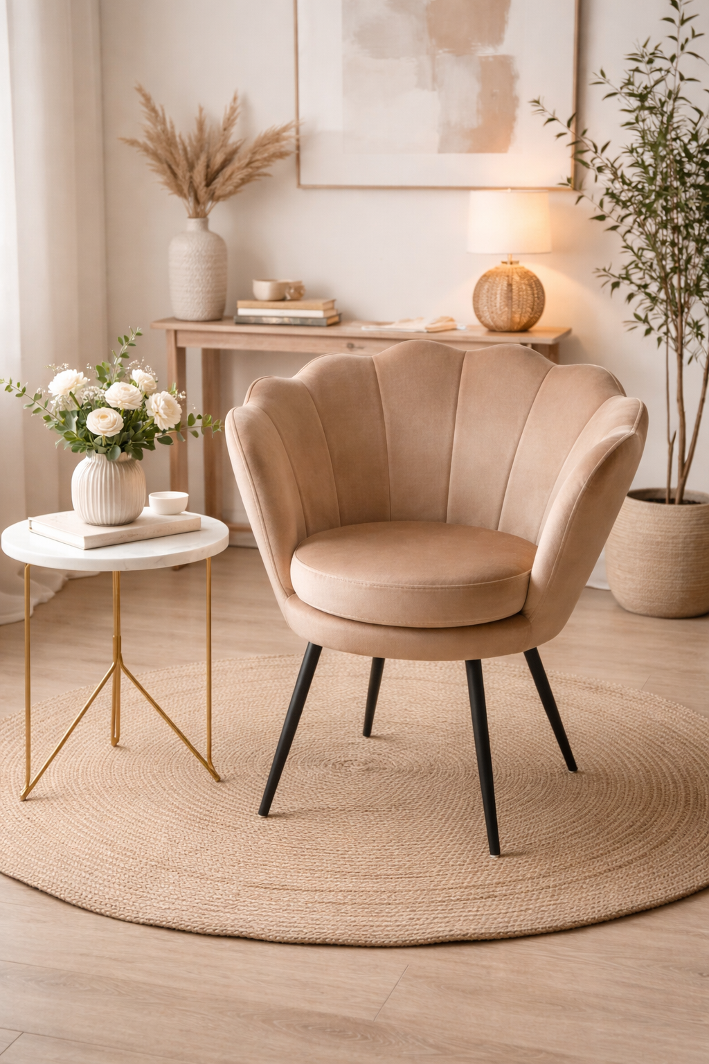 Charakterystyczne oparcie w kształcie muszli nadaje wnętrzu lekkości i stylu glamour, a miękka tapicerka velvet przyjemnie otula podczas siedzenia.