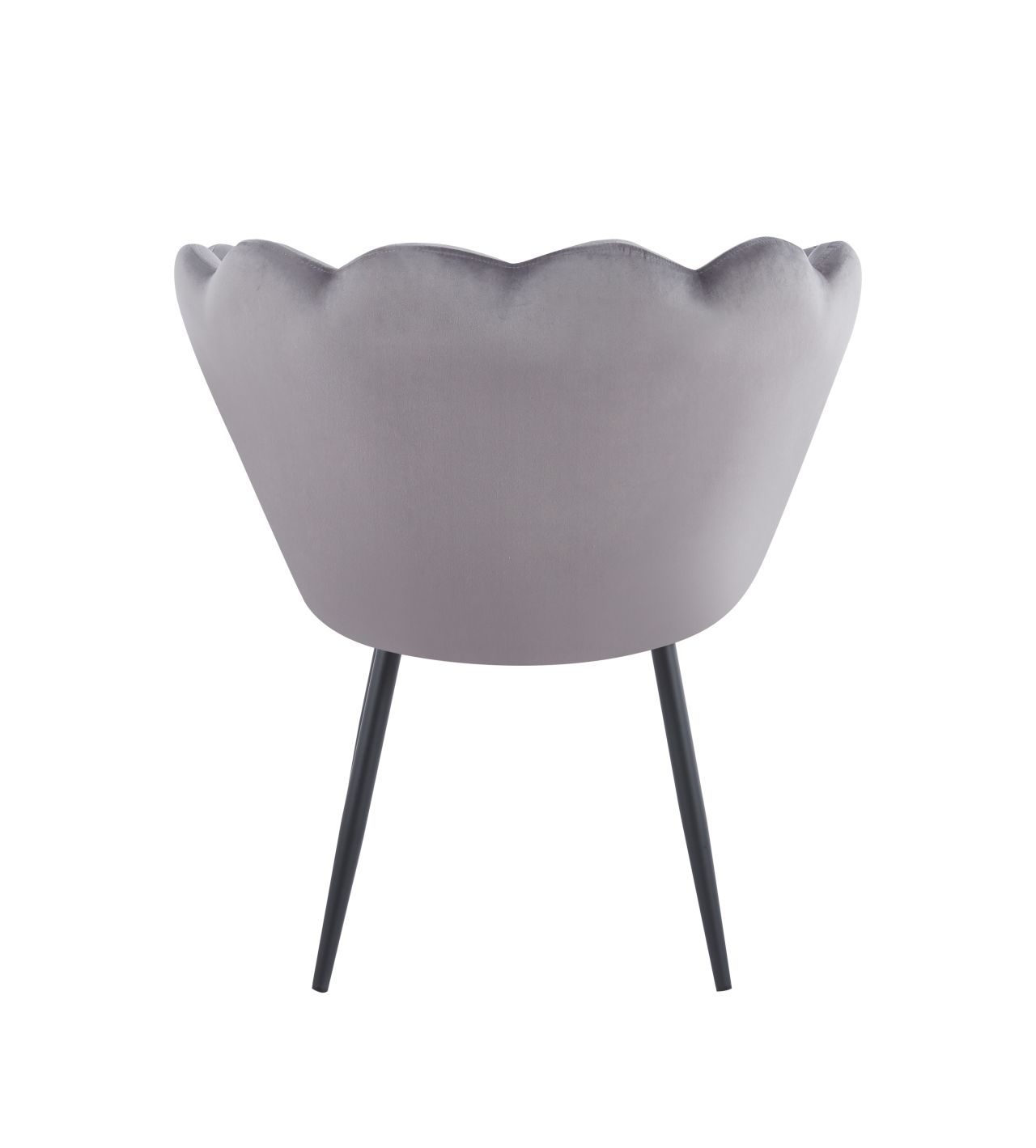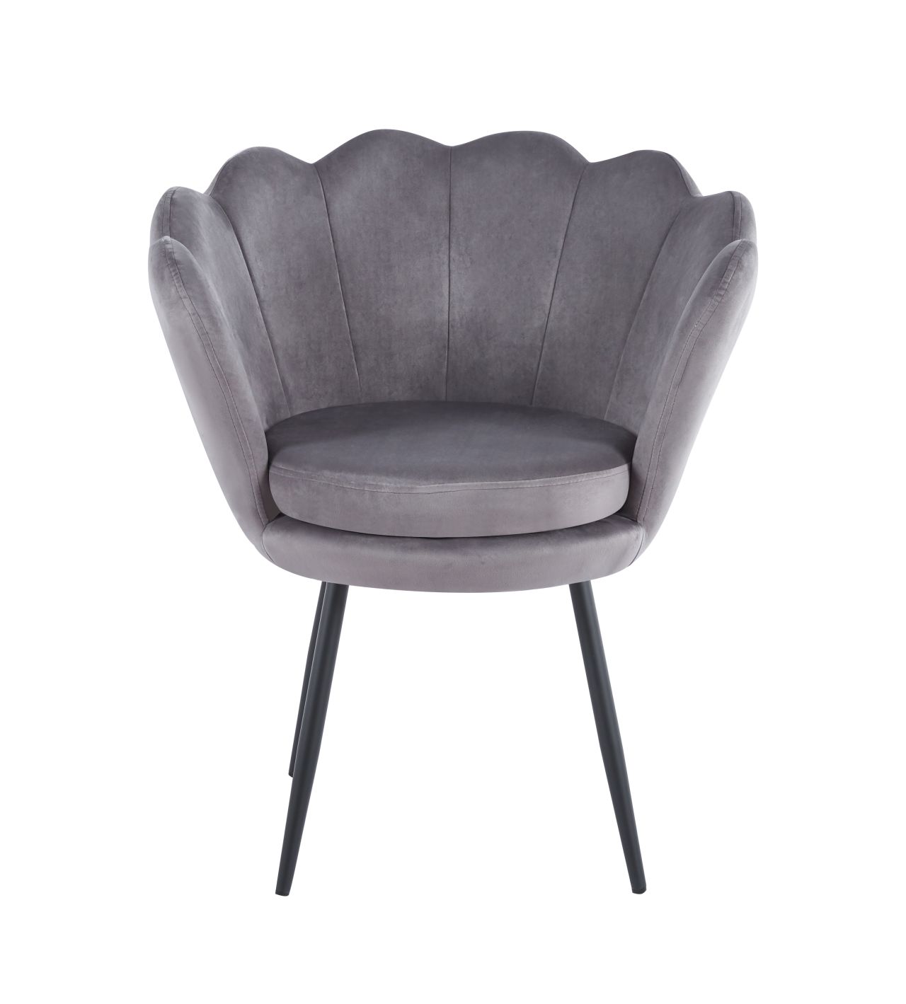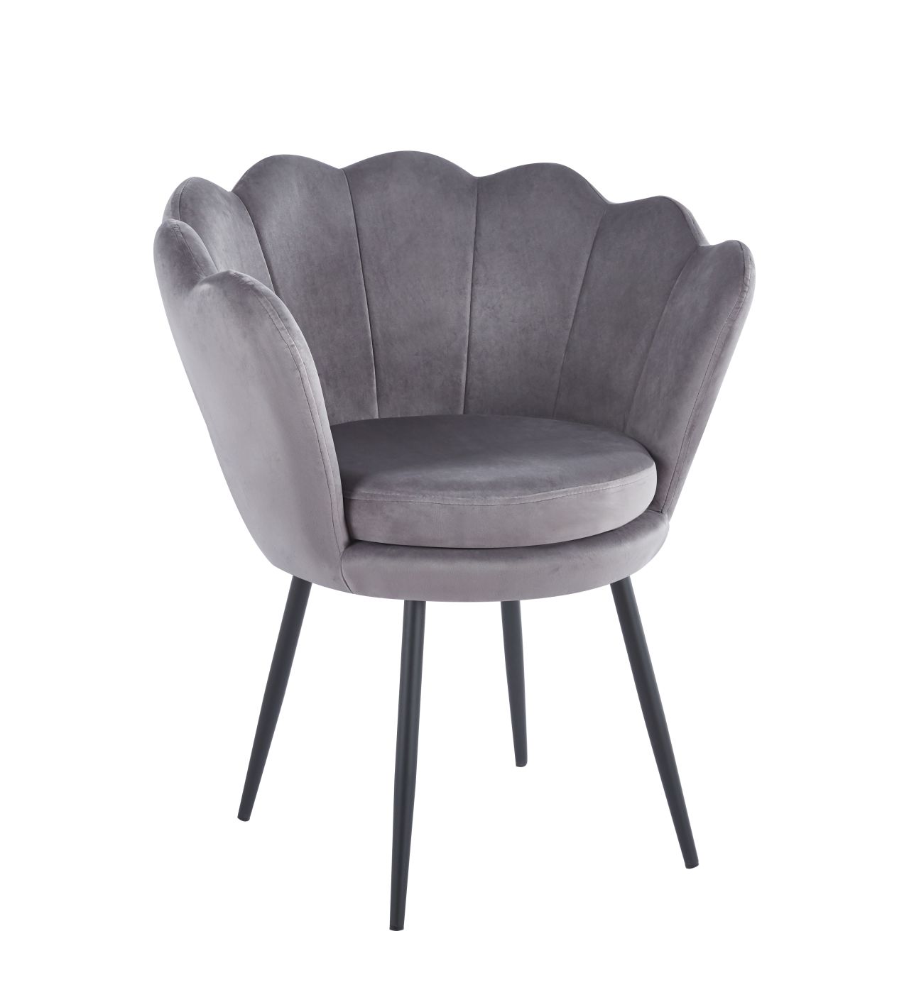 Charakterystyczne oparcie w kształcie muszli nadaje wnętrzu lekkości i stylu glamour, a miękka tapicerka velvet przyjemnie otula podczas siedzenia.