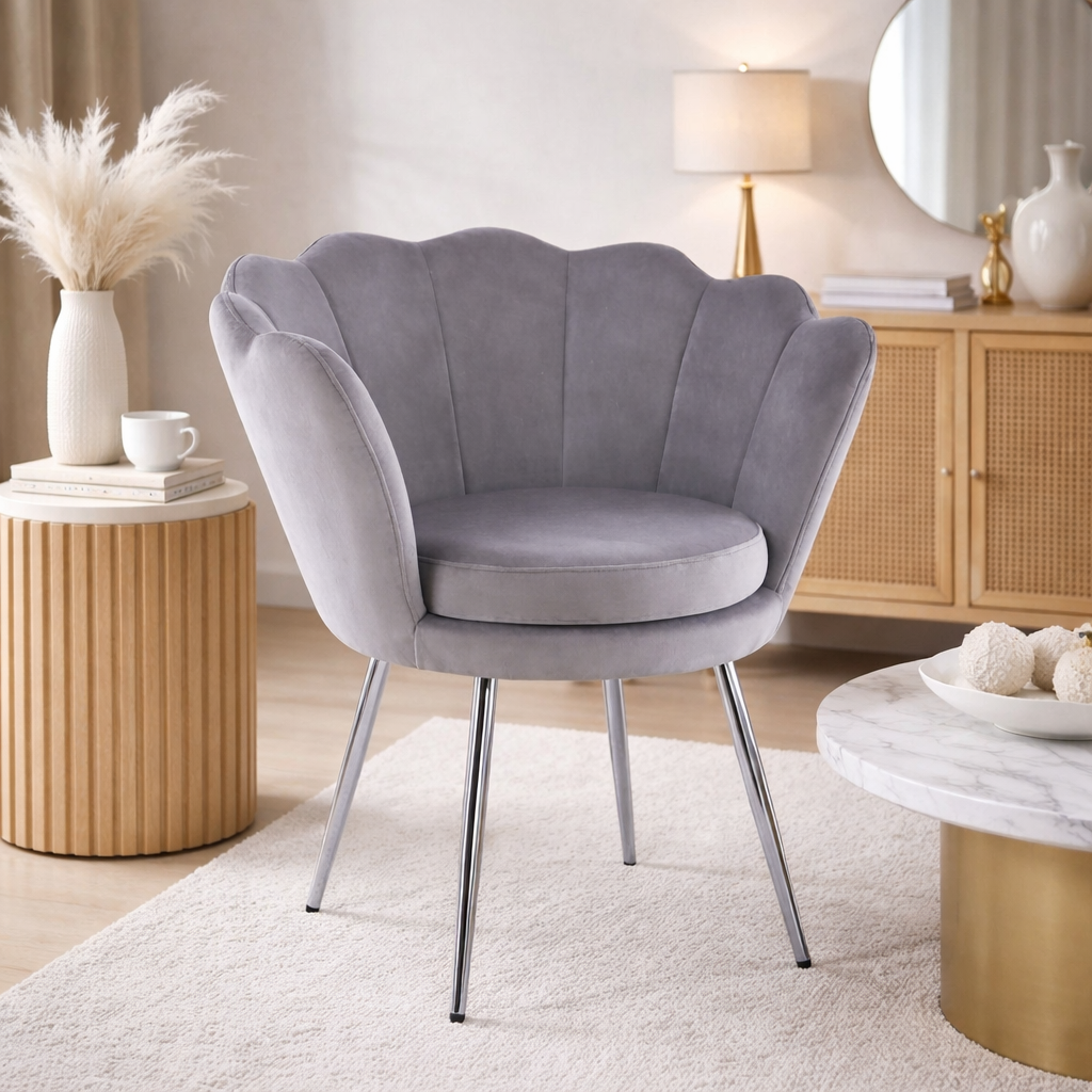 Charakterystyczne oparcie w kształcie muszli nadaje wnętrzu lekkości i stylu glamour, a miękka tapicerka velvet przyjemnie otula podczas siedzenia.