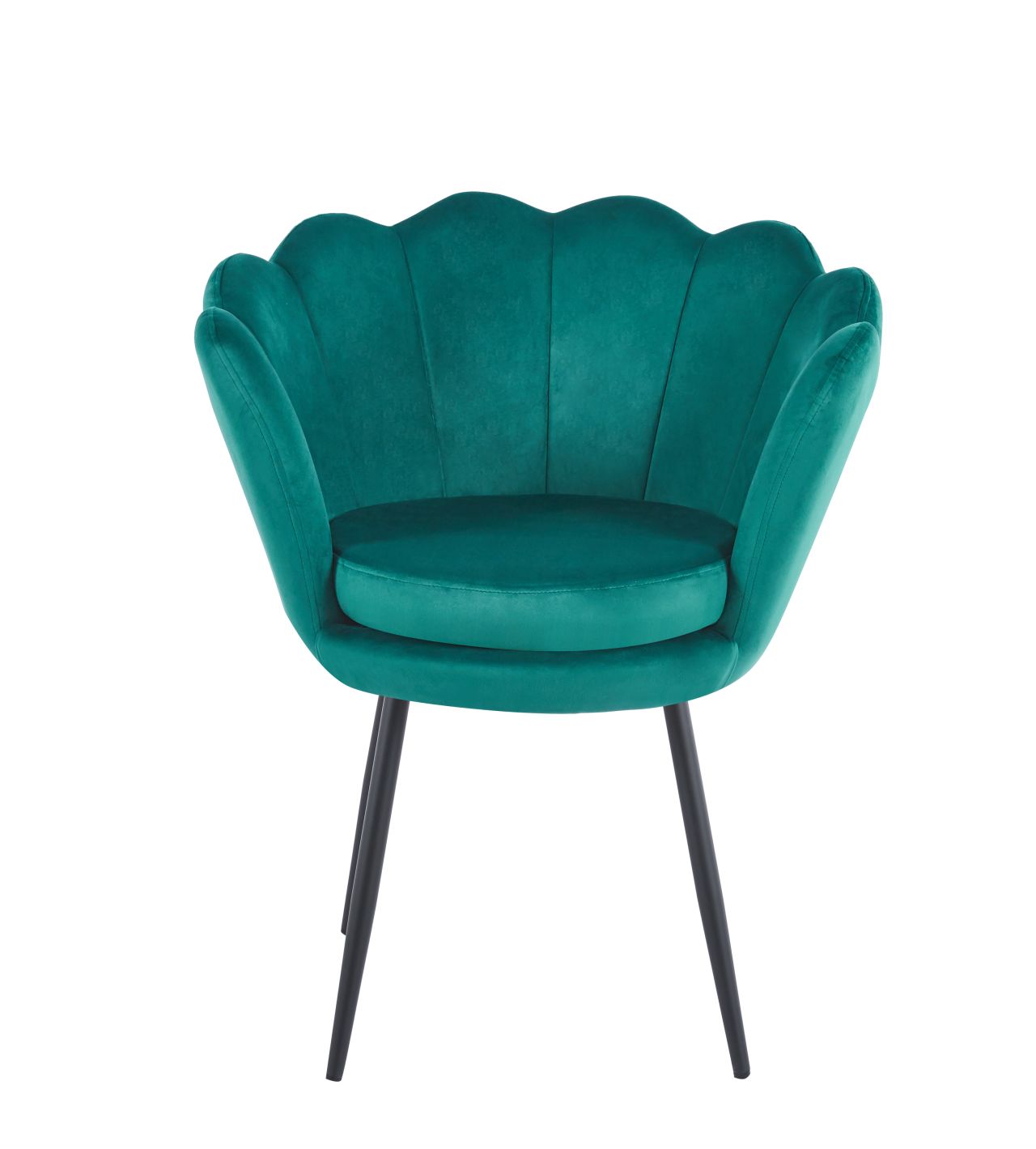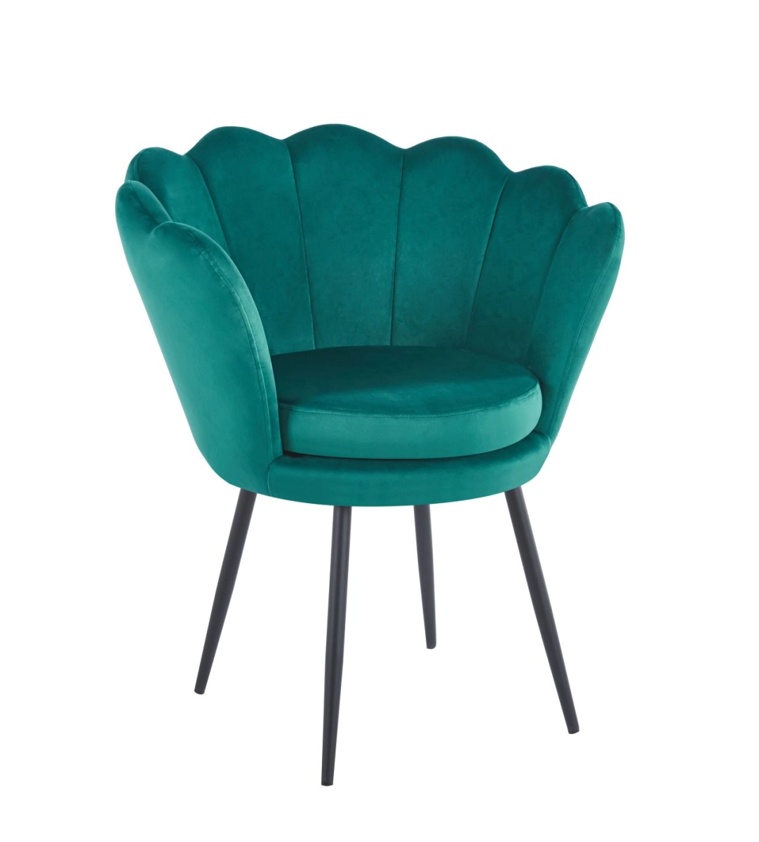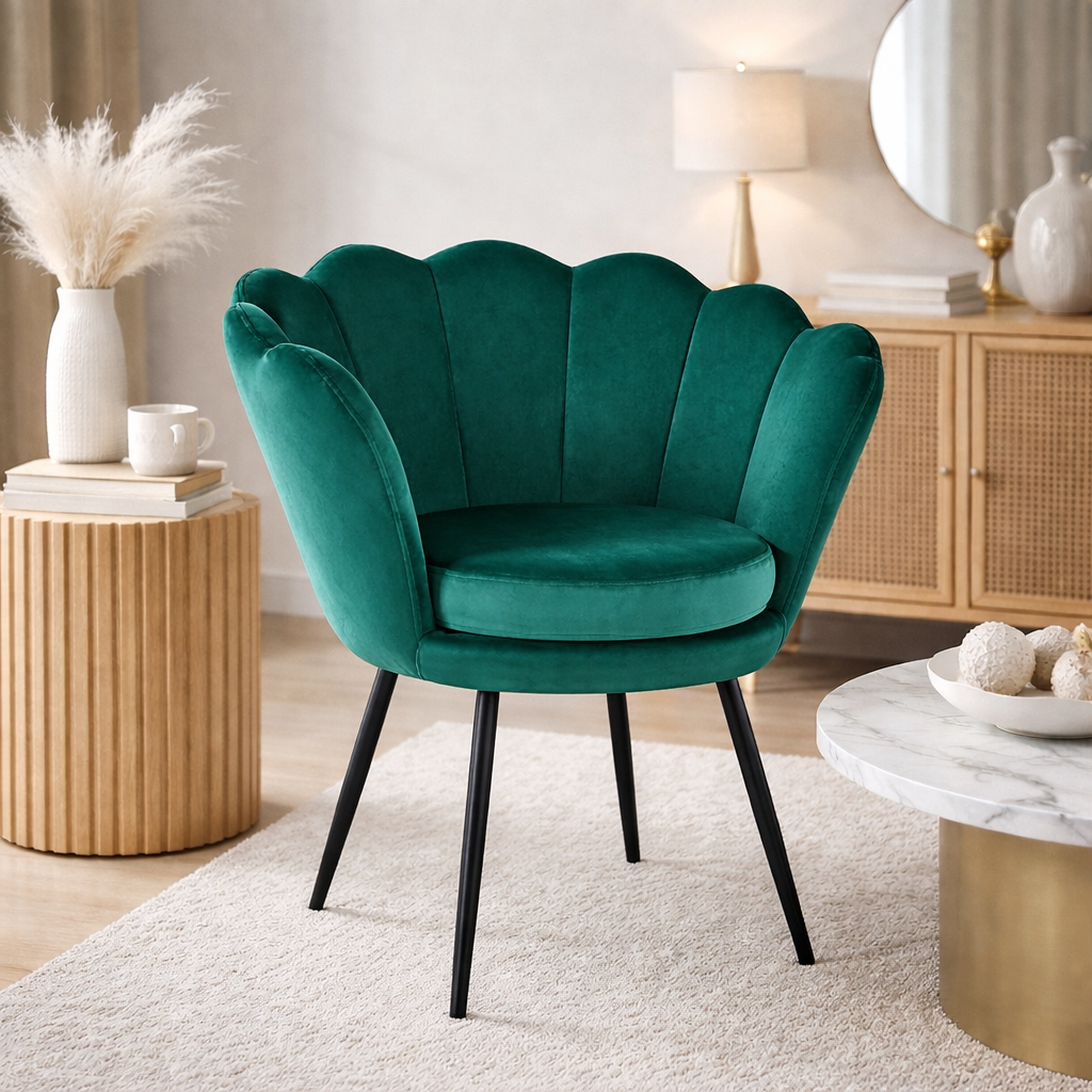 Charakterystyczne oparcie w kształcie muszli nadaje wnętrzu lekkości i stylu glamour, a miękka tapicerka velvet przyjemnie otula podczas siedzenia.