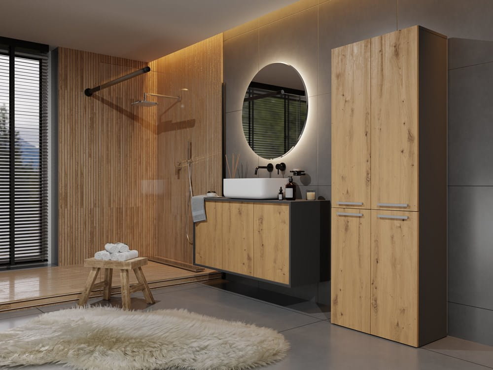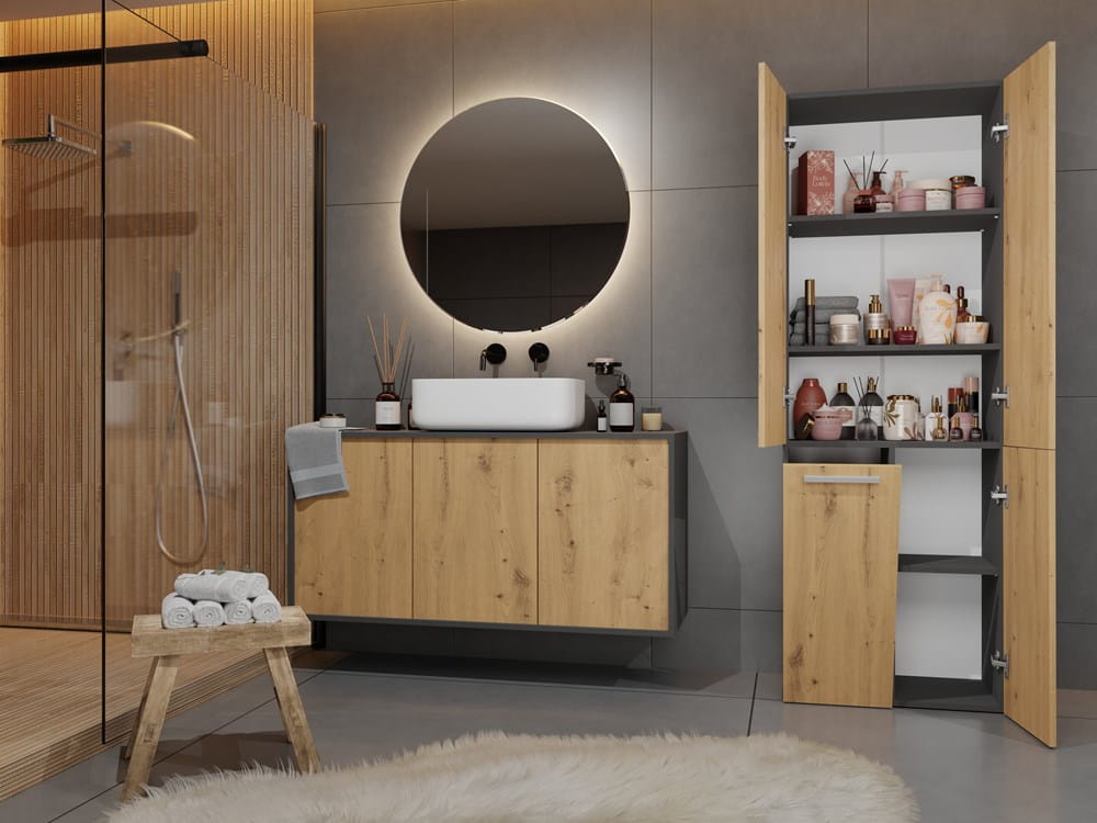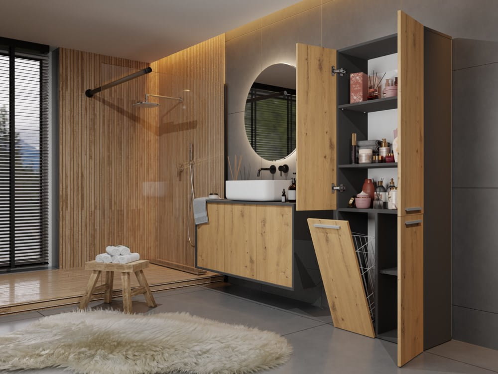 Słupek łazienkowy z długimi drzwiami oraz koszem, antracyt/dąb artisan Nel