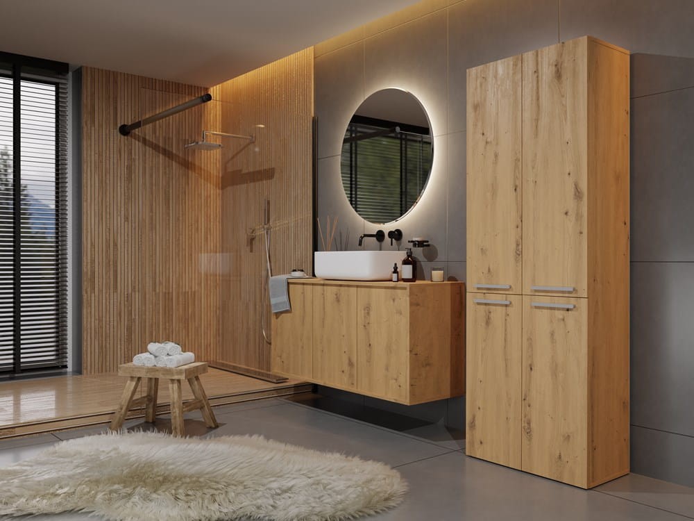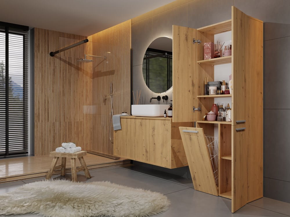 Słupek łazienkowy z długimi drzwiami oraz koszem, dąb artisan Nel