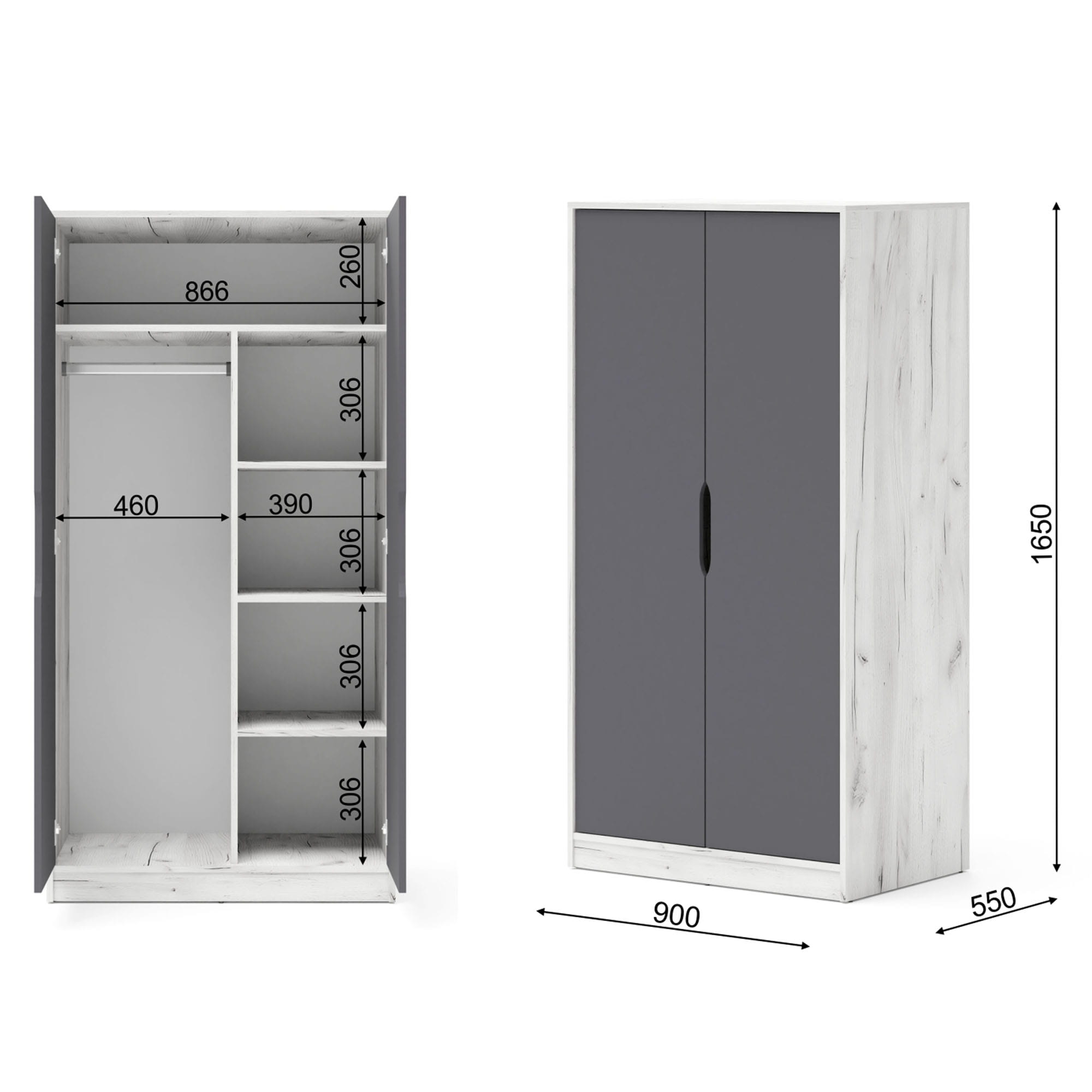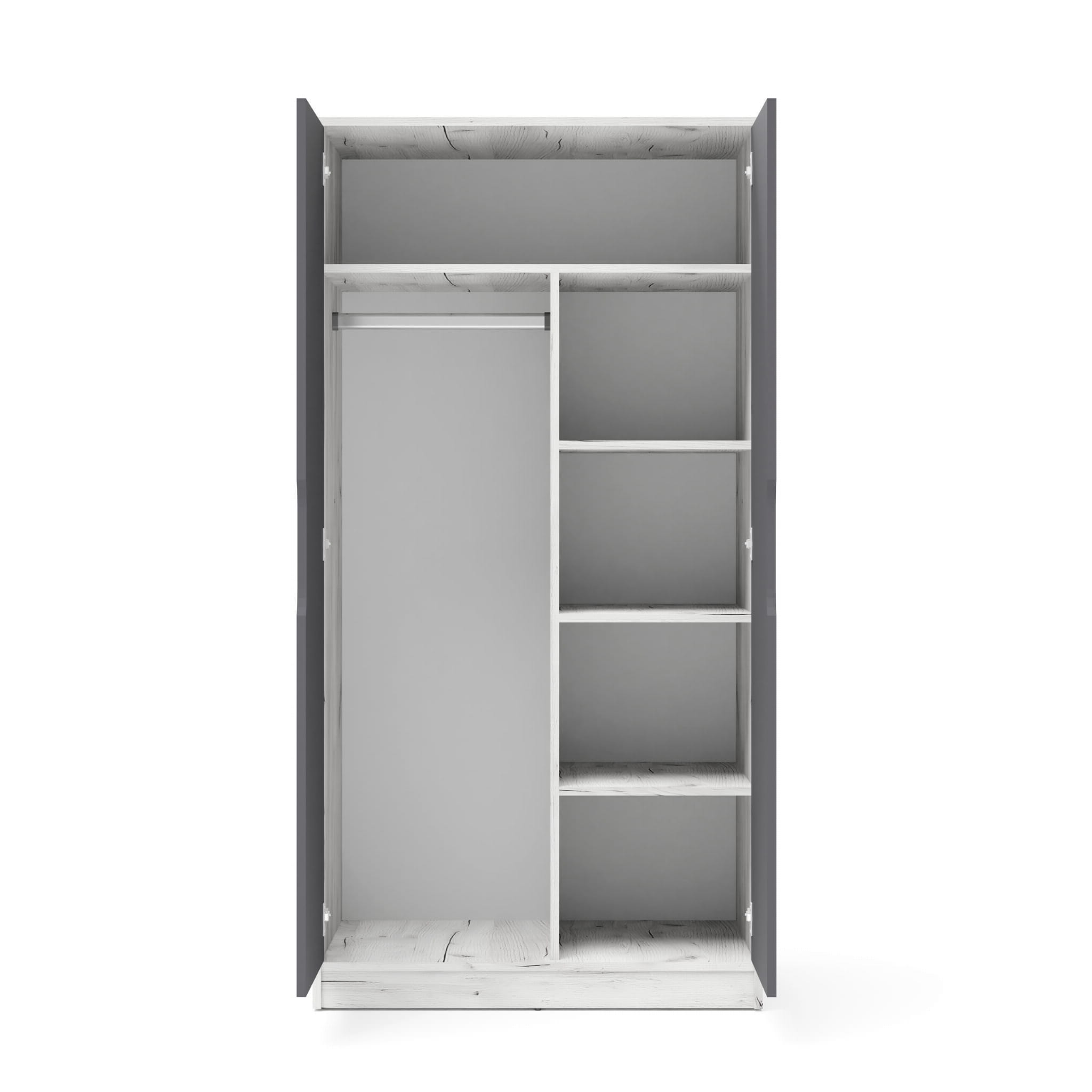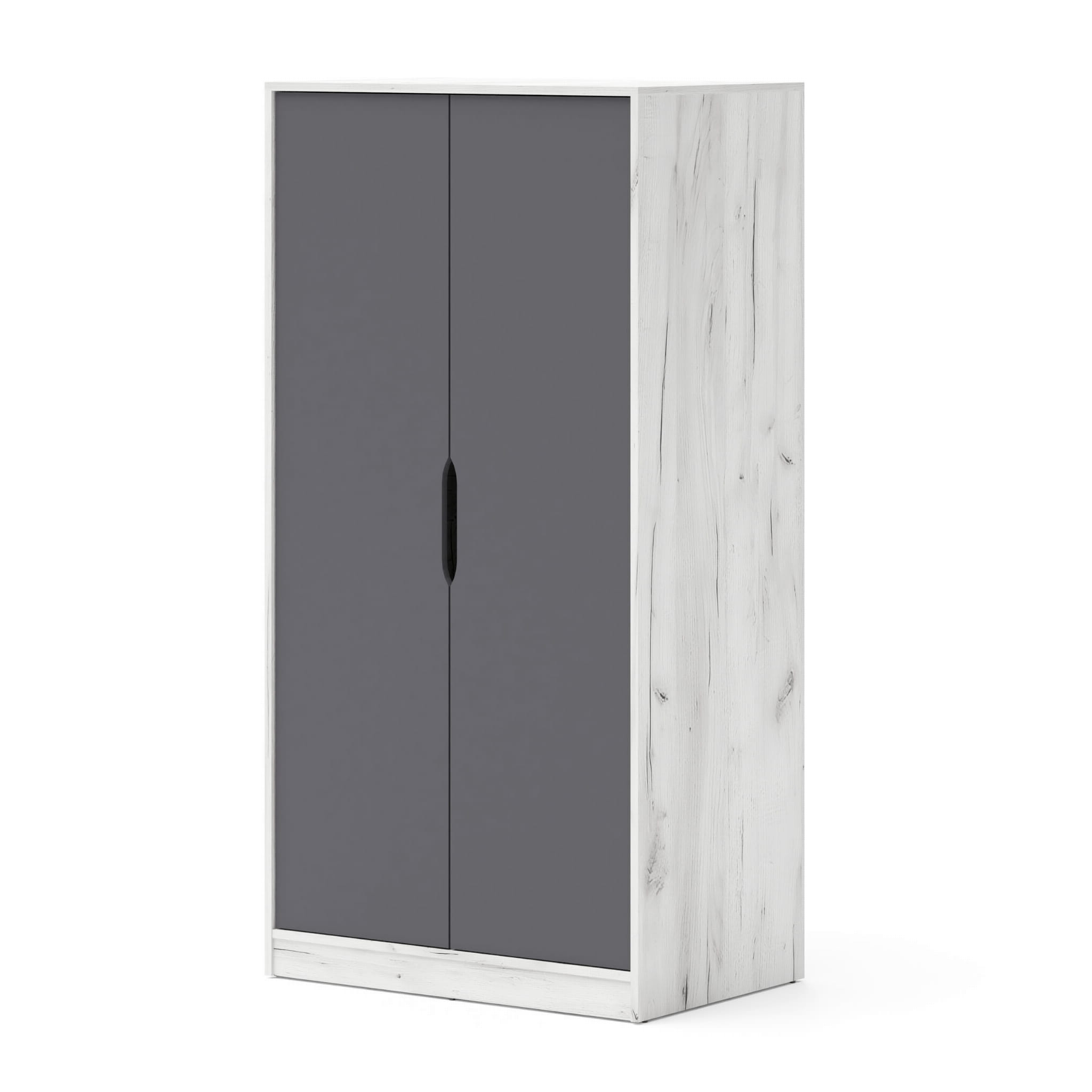 Wykończenie w kolorach craft biały i grafit nadaje szafie elegancji i nowoczesnego charakteru, podkreślając jej uniwersalny design. Wnętrze zostało zaprojektowane z myślą o praktycznym przechowywaniu – wyposażone w drążek na ubrania oraz pięć pojemnych półek, które pomogą utrzymać porządek.