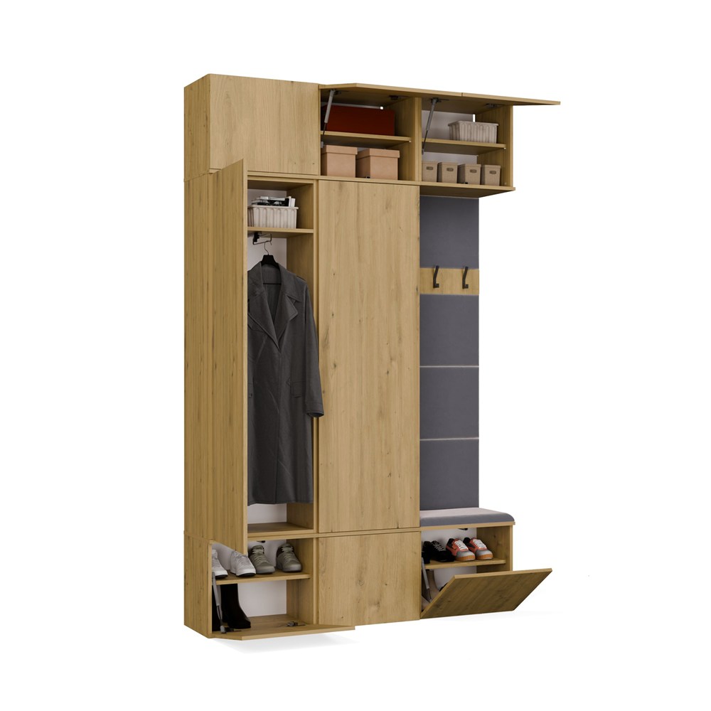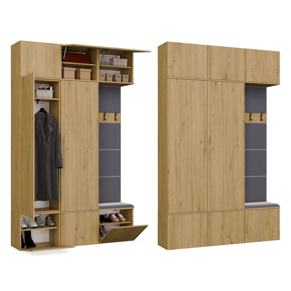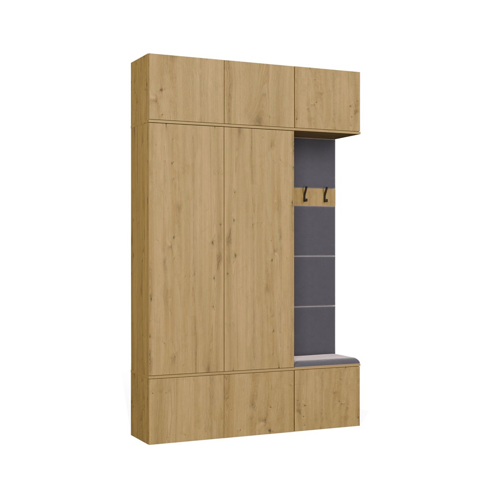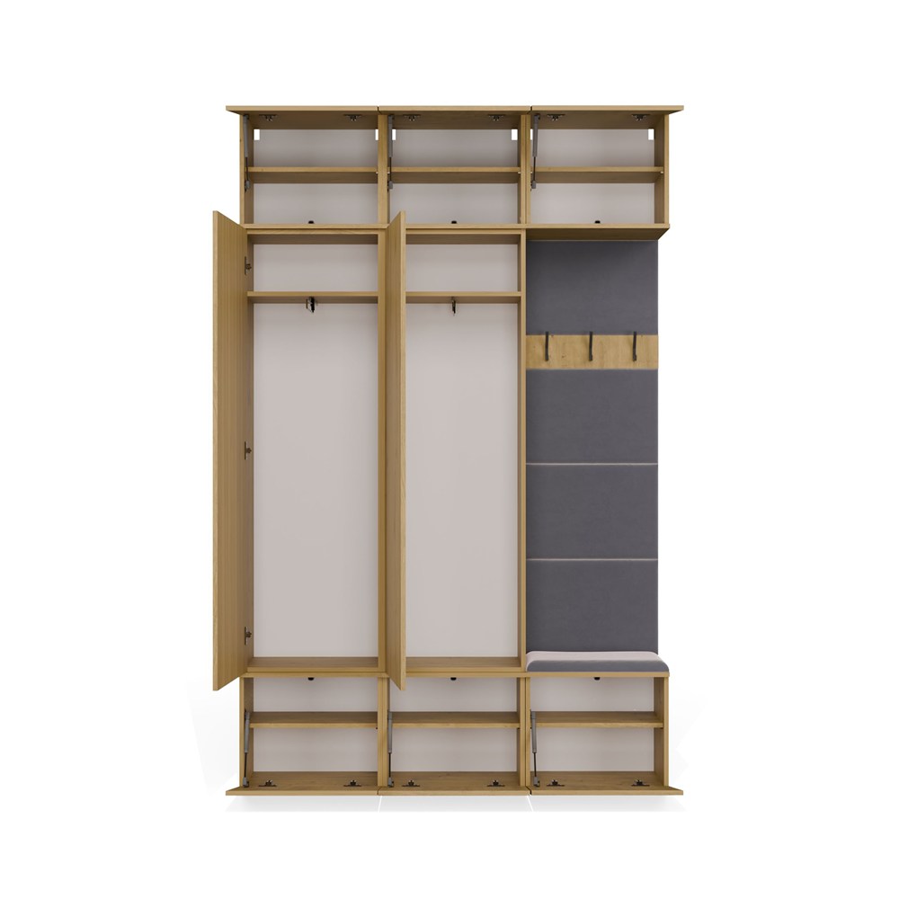 Zestaw składa się z dwóch pojemnych szaf oraz praktycznego modułu z wieszakiem, tapicerowanym siedziskiem, panelem oparcia i szafkami.