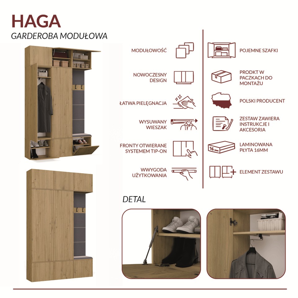 Modułowa konstrukcja serii HAGA pozwala swobodnie zestawiać elementy i dopasować układ garderoby do wielkości pomieszczenia oraz indywidualnych potrzeb domowników.