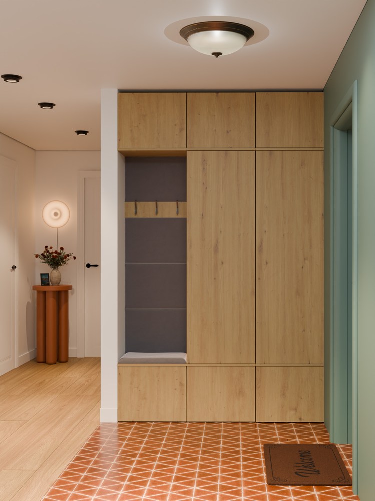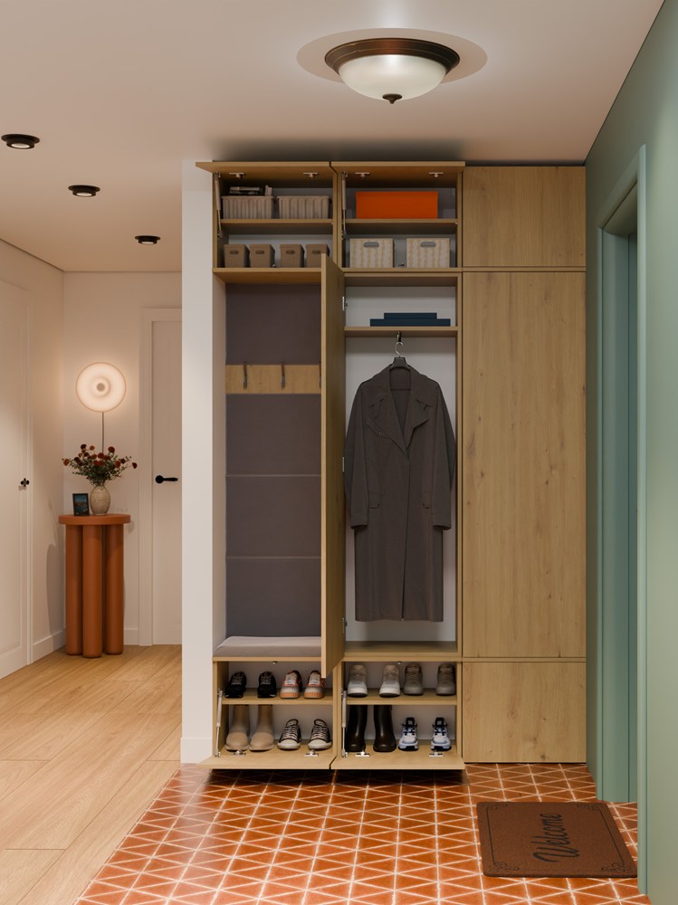 Garderoba sprawdzi się zarówno w mieszkaniu, jak i w domu jednorodzinnym, tworząc wygodną strefę wejściową z dużą ilością miejsca do przechowywania.