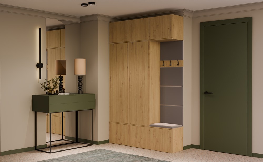 To propozycja dla osób, które chcą uporządkować odzież wierzchnią, buty i codzienne akcesoria, zachowując przy tym spójny, nowoczesny wygląd wnętrza.
