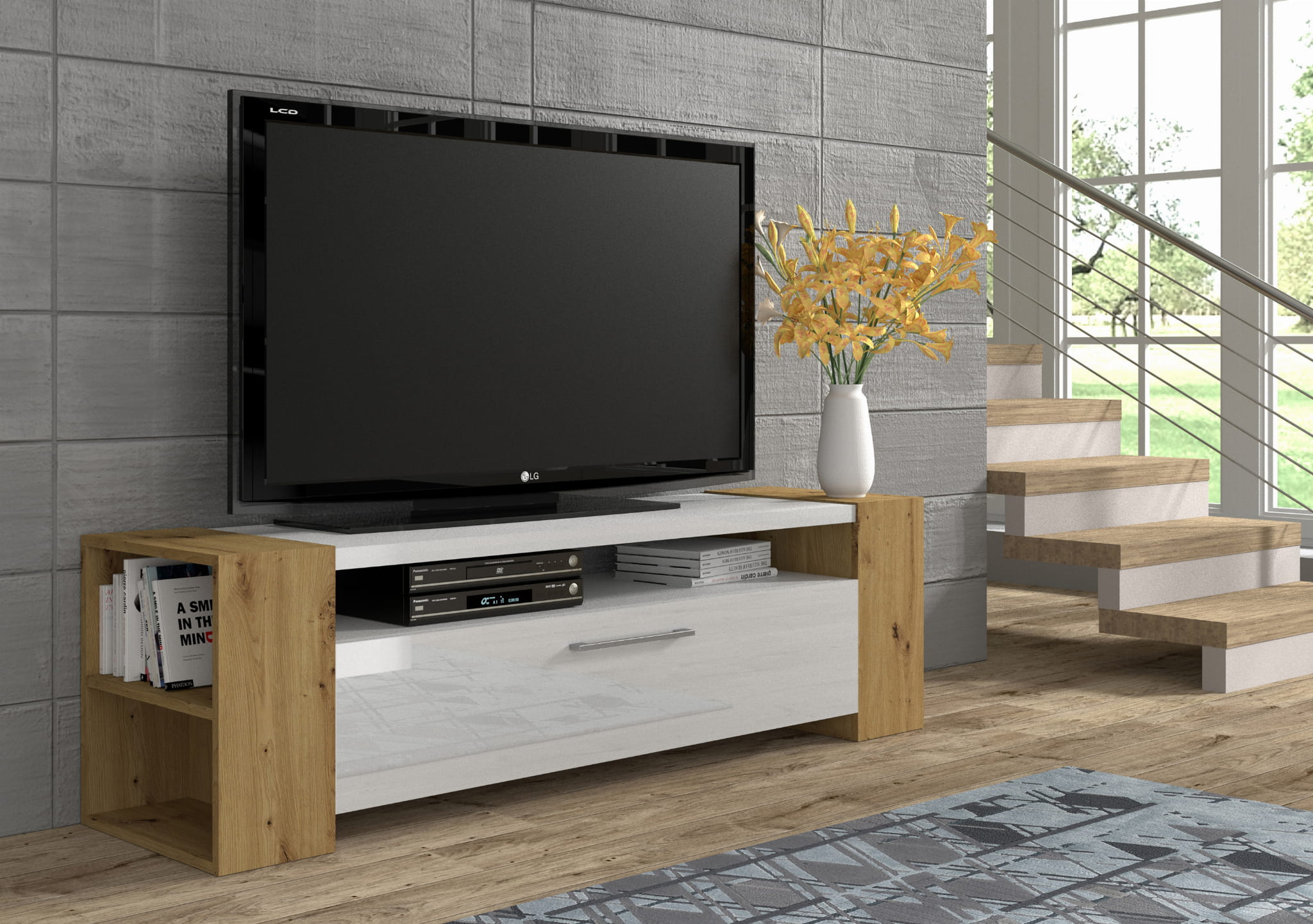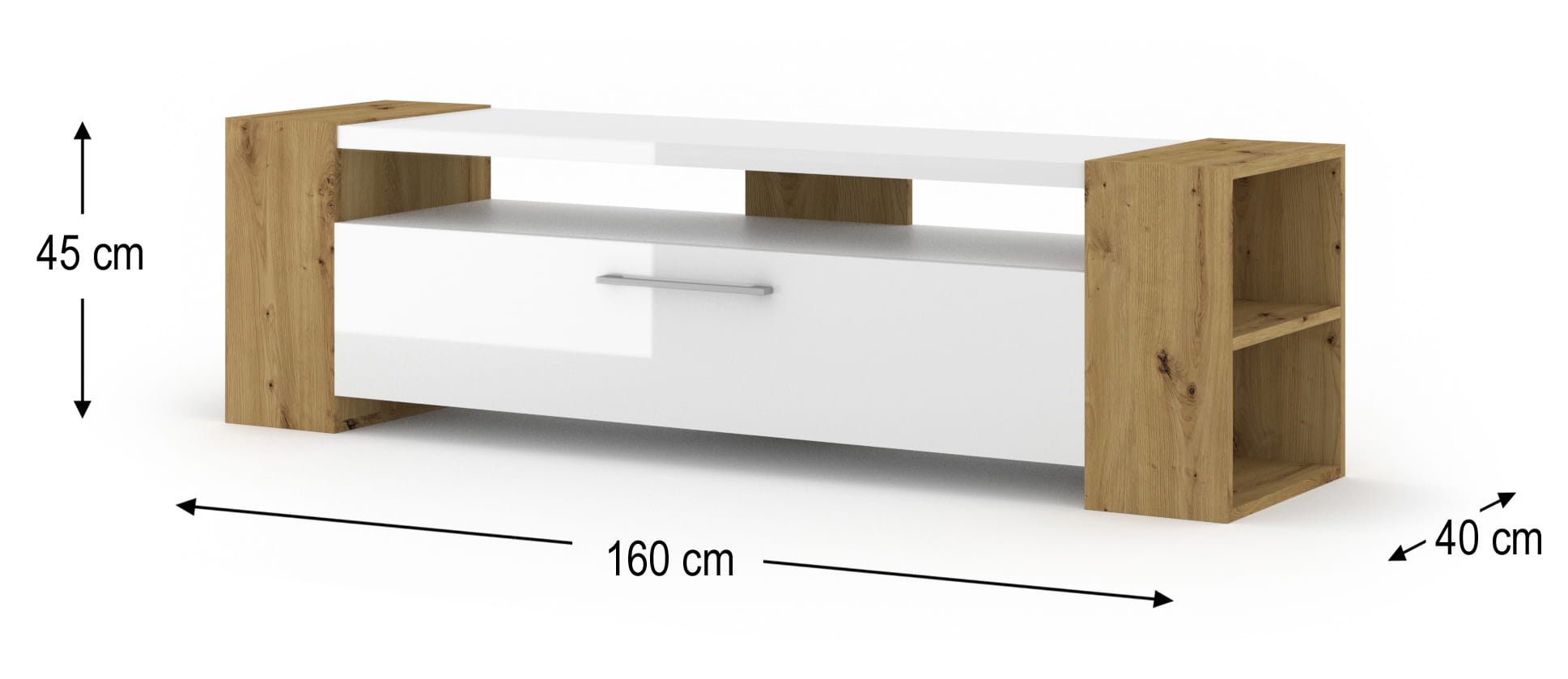 Szafka RTV 160 cm, do salonu dąb artisan/biały połysk Livia