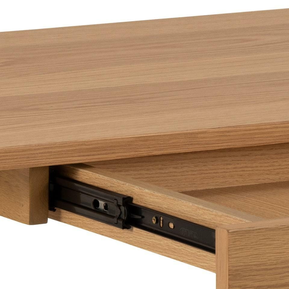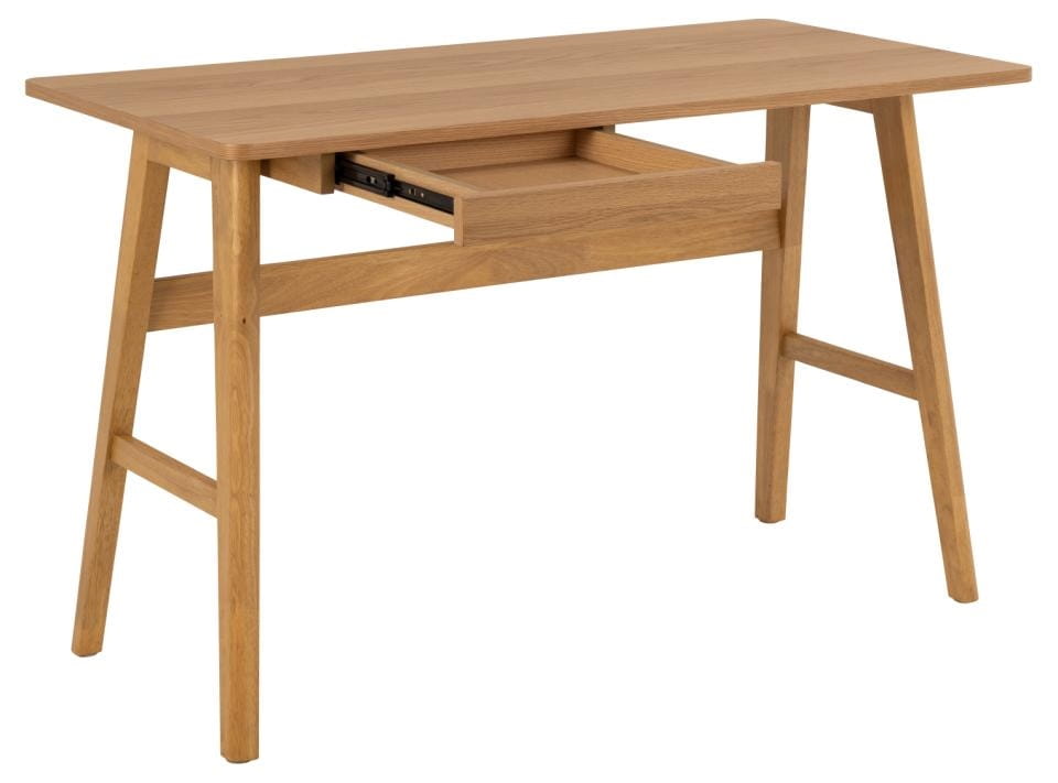 Elegancka konstrukcja ma blat z płyty MDF i forniru dębowego i małą szufladę po prawej stronie.