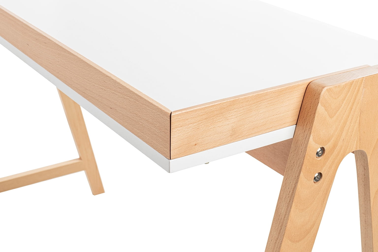 Wytrzymała konstrukcja: Blat biurka wykonany z płyty meblowej malowanej na kolor biały gwarantuje trwałość i stabilność podczas codziennego użytkowania.