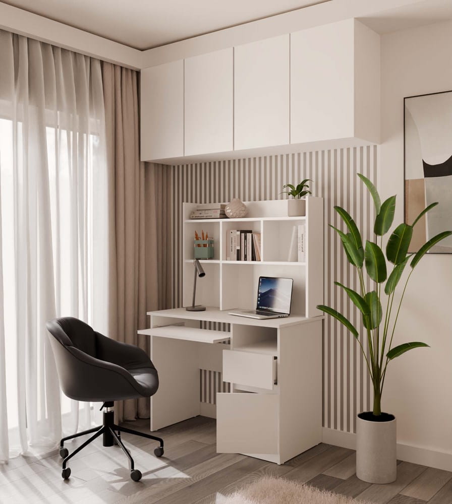 Dzięki rozbudowanej nadstawce wszystkie niezbędne przedmioty są zawsze pod ręką. Biurko łączy przestronny blat z wygodnymi miejscami do przechowywania, co sprzyja organizacji i zachowaniu porządku. To mebel, który zapewnia komfort pracy i nauki na co dzień.