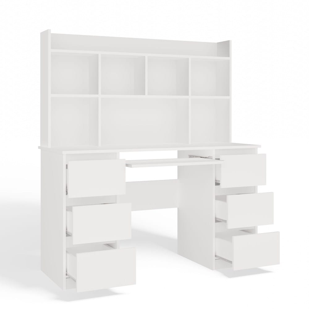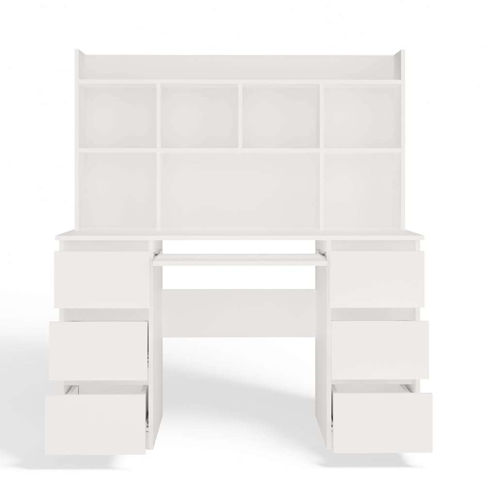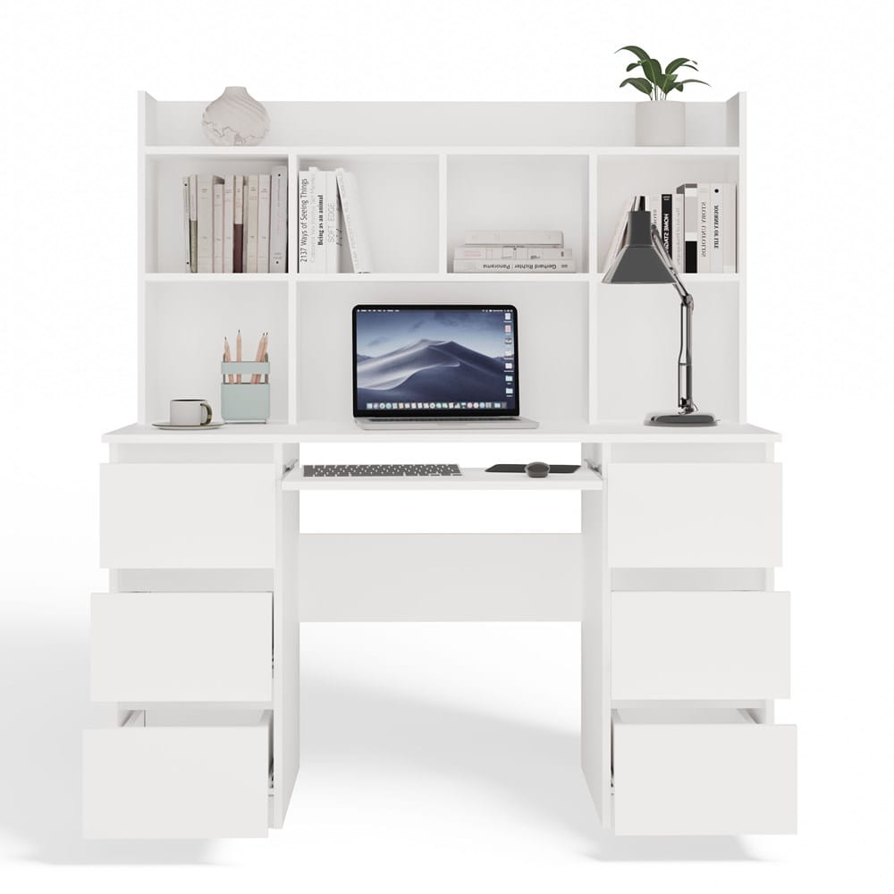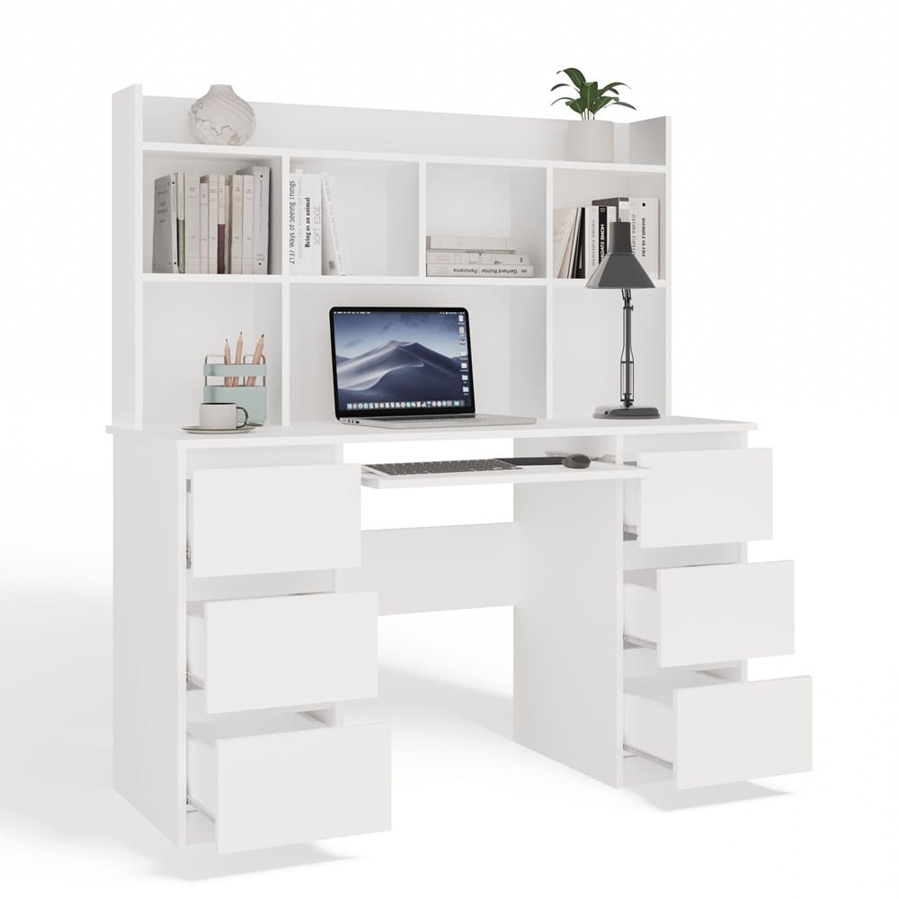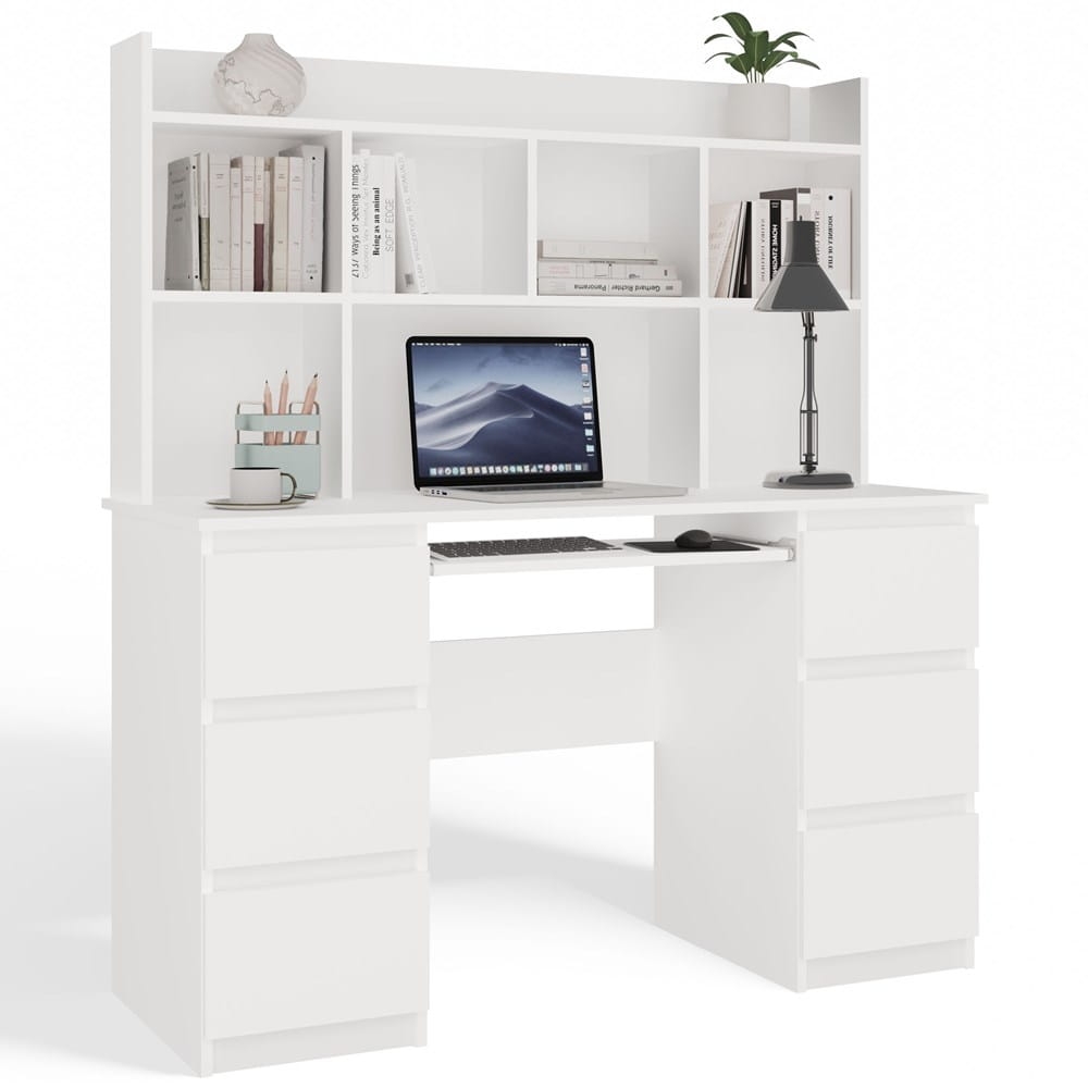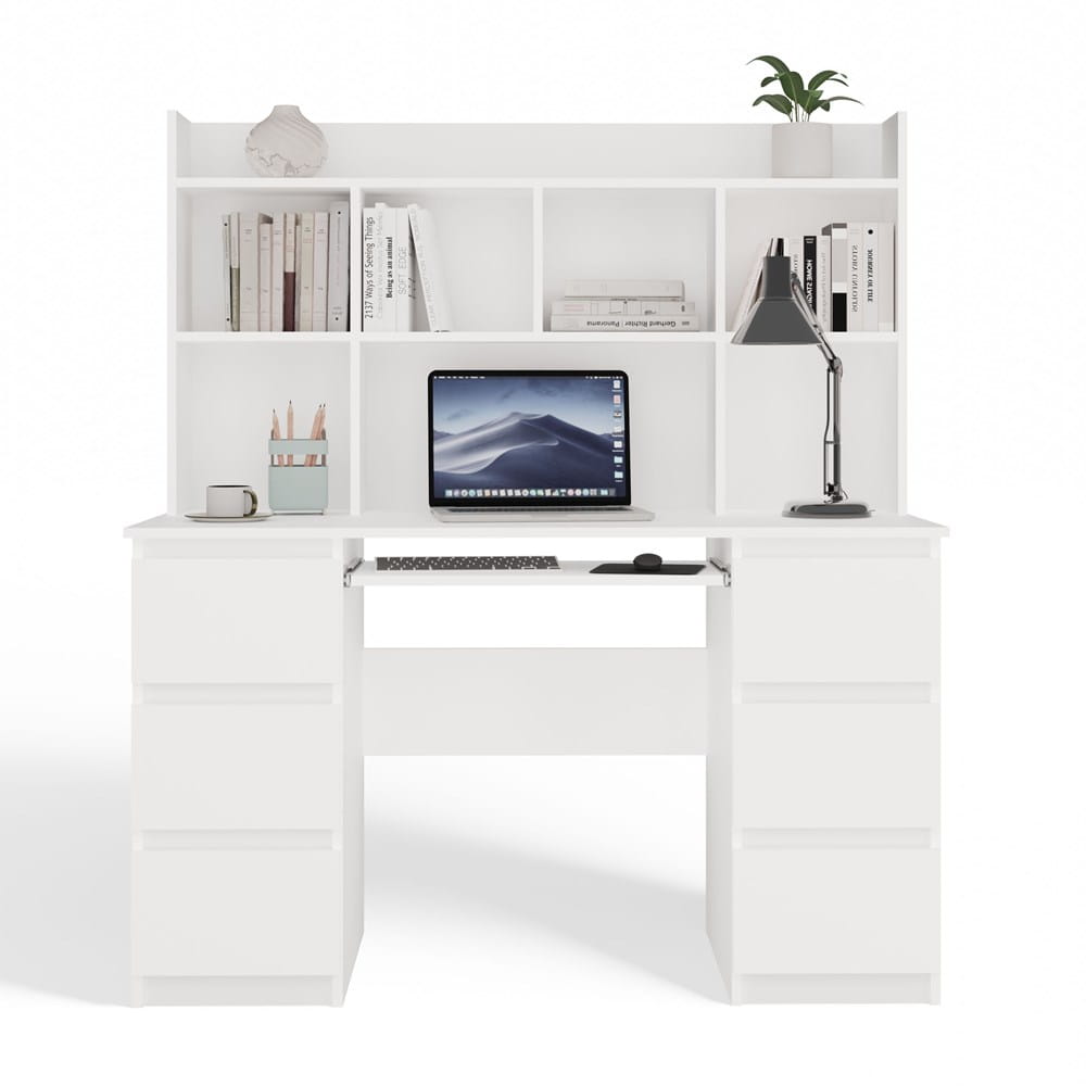 Biurko wyposażono w 6 pojemnych szuflad idealnych na dokumenty, przybory biurowe i drobiazgi oraz wysuwaną półkę na klawiaturę, co znacząco poprawia ergonomię pracy przy komputerze. Dopasowana nadstawka z 5 funkcjonalnymi półkami pozwala na przechowywanie książek, zeszytów i dekoracji — wszystko w zasięgu ręki.