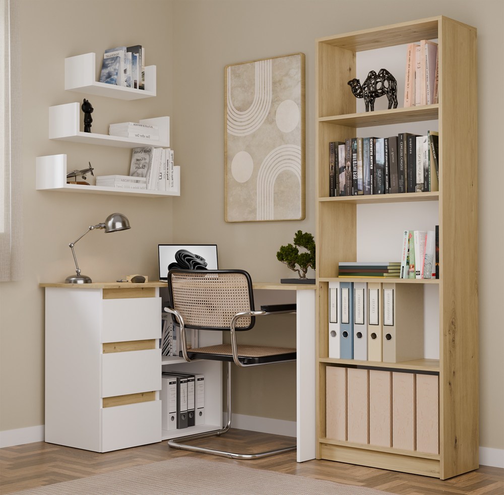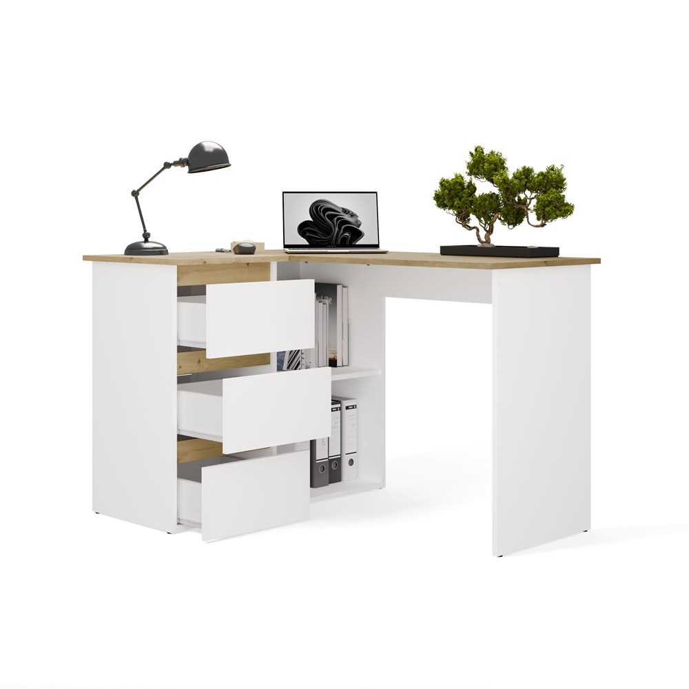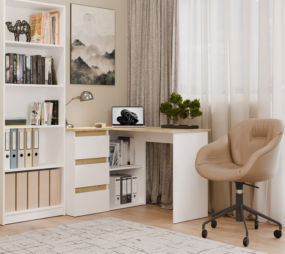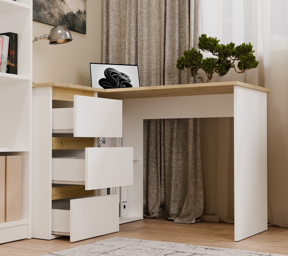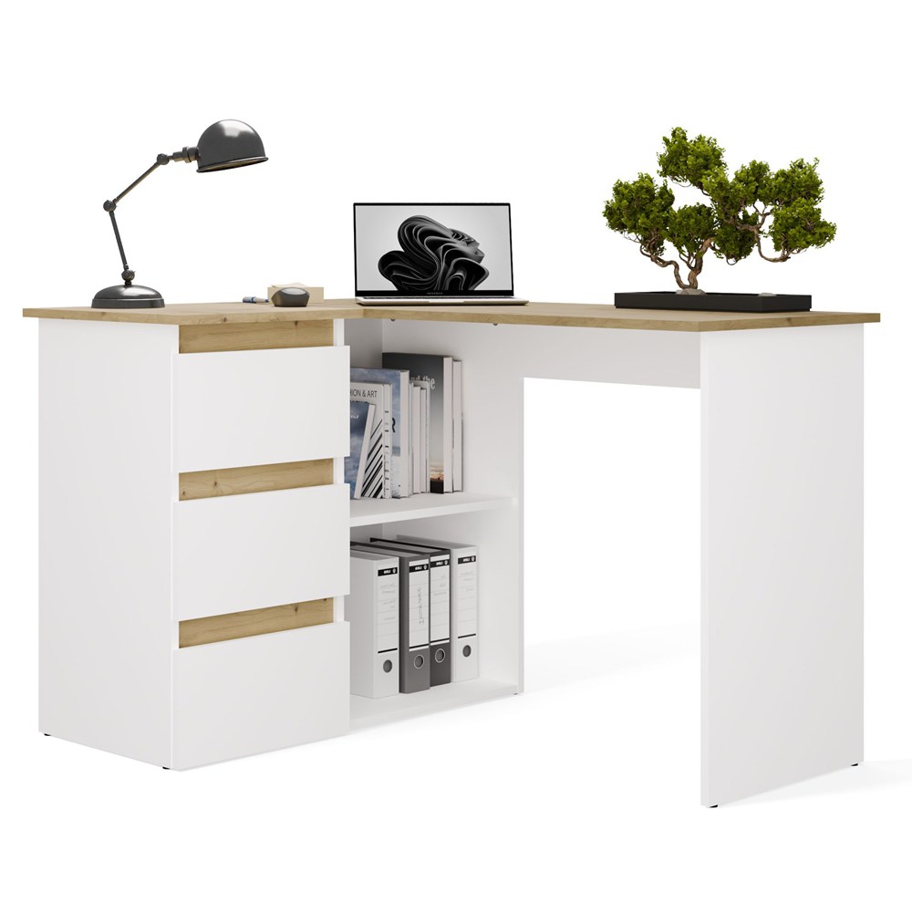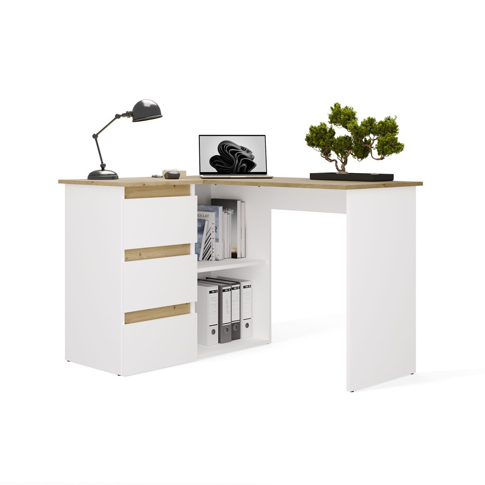 Biurko narożne NICEA lewe w kolorze białym mat oraz dąb artisan to funkcjonalna propozycja do domowego biura, pokoju młodzieżowego lub kącika do nauki i pracy. Nowoczesna, prosta forma sprawia, że mebel świetnie wpisuje się w aktualne trendy wnętrzarskie, łącząc estetykę z praktycznym wykorzystaniem przestrzeni.