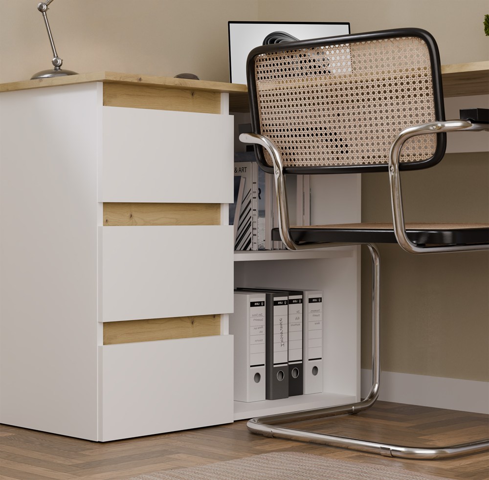 Narożna konstrukcja pozwala lepiej zagospodarować dostępne miejsce, dlatego model NICEA doskonale sprawdza się zarówno w mniejszych pomieszczeniach, jak i w bardziej rozbudowanych strefach home office. Jasne wykończenie w odcieniu bieli mat optycznie rozjaśnia wnętrze i nadaje mu lekkości.