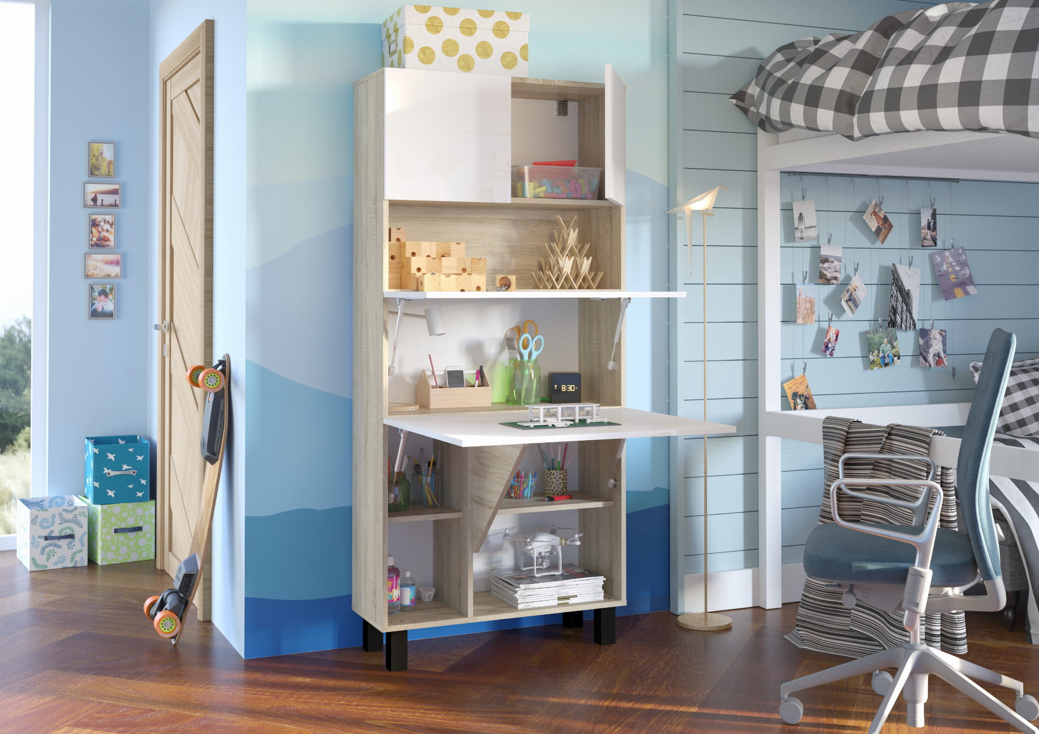Biurko rozkładane do pokoju dziecięcego, dąb sonoma/biały połysk Homi