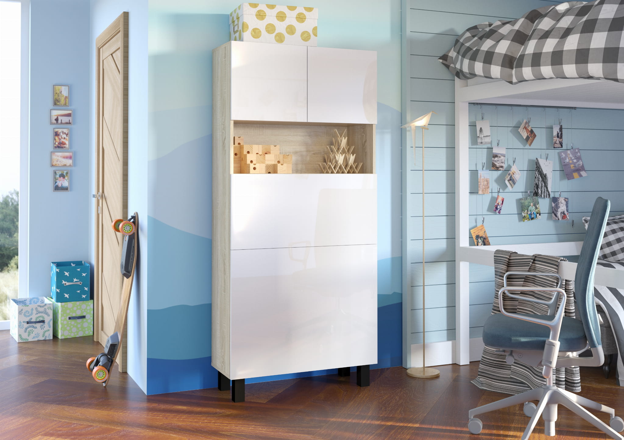 Sześć zamykanych półek oraz jedna półka otwarta oferują mnóstwo miejsca na akcesoria, książki, teczki, segregatory czy przybory biurowe. To idealne rozwiązanie dla osób, które cenią porządek i praktyczne podejście do organizacji.