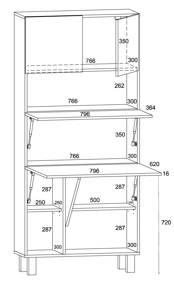 - Rozkładana półka nad blatem – dodatkowa przestrzeń na książki i akcesoria
