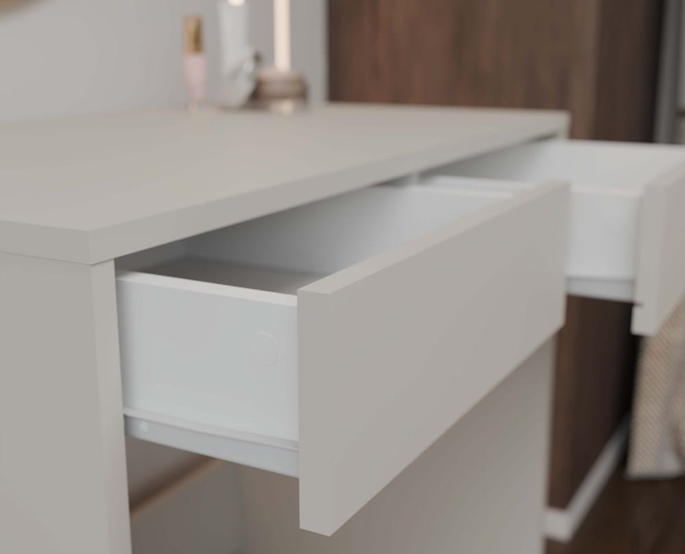 Biurko wyposażone zostało w dwie płynnie wysuwane szuflady z blokadą, które zapewniają bezpieczne przechowywanie dokumentów, przyborów i drobiazgów. Minimalistyczny charakter mebla podkreślają bezuchwytowe fronty, które idealnie wpisują się w nowoczesne wnętrza.