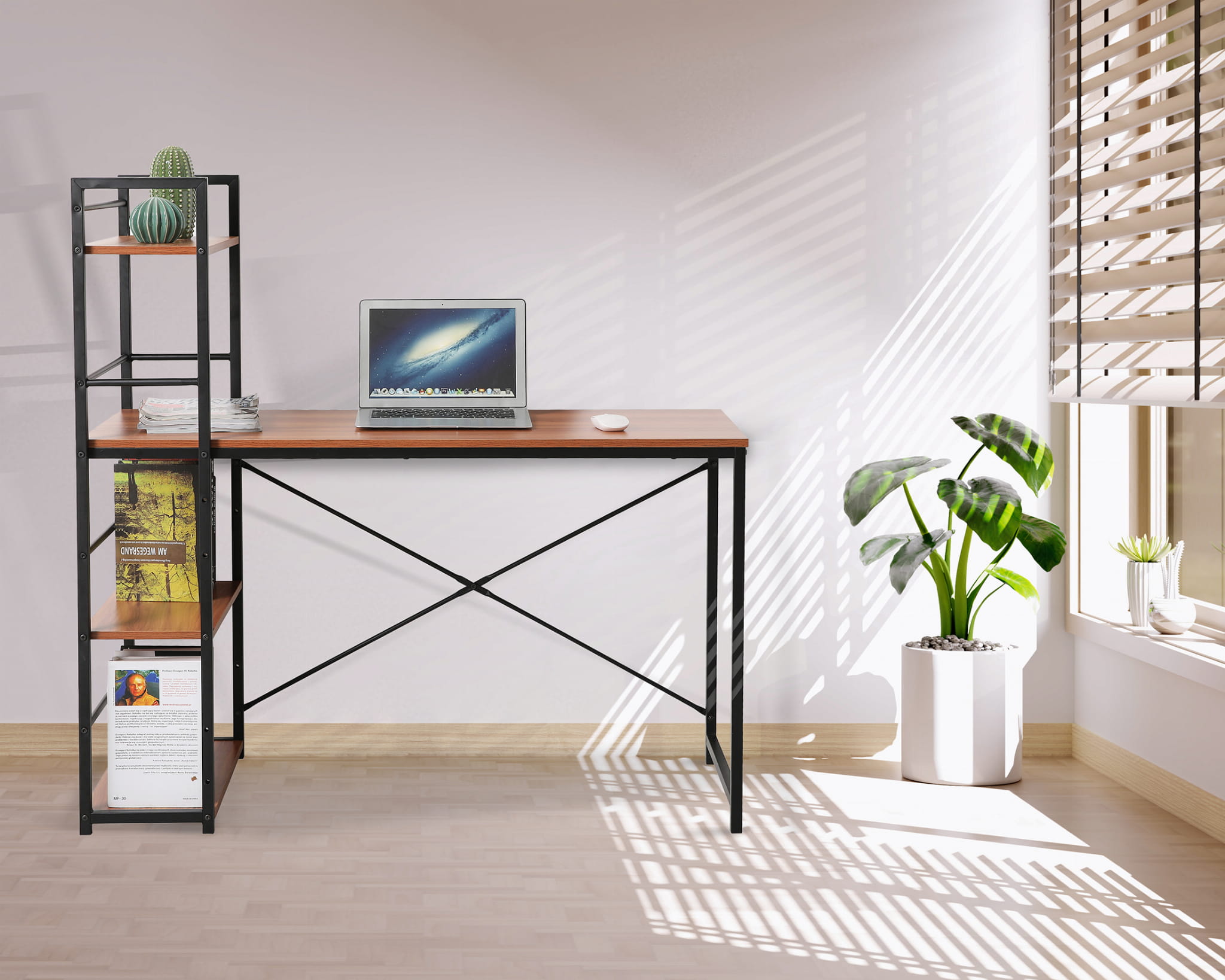 Na pojemnych półkach regału bez problemu przechowasz książki, dokumenty, segregatory i inne akcesoria biurowe, zachowując porządek i funkcjonalność przestrzeni. Przestronny blat roboczy zapewnia wygodę podczas pisania, pracy przy komputerze czy tworzenia projektów.