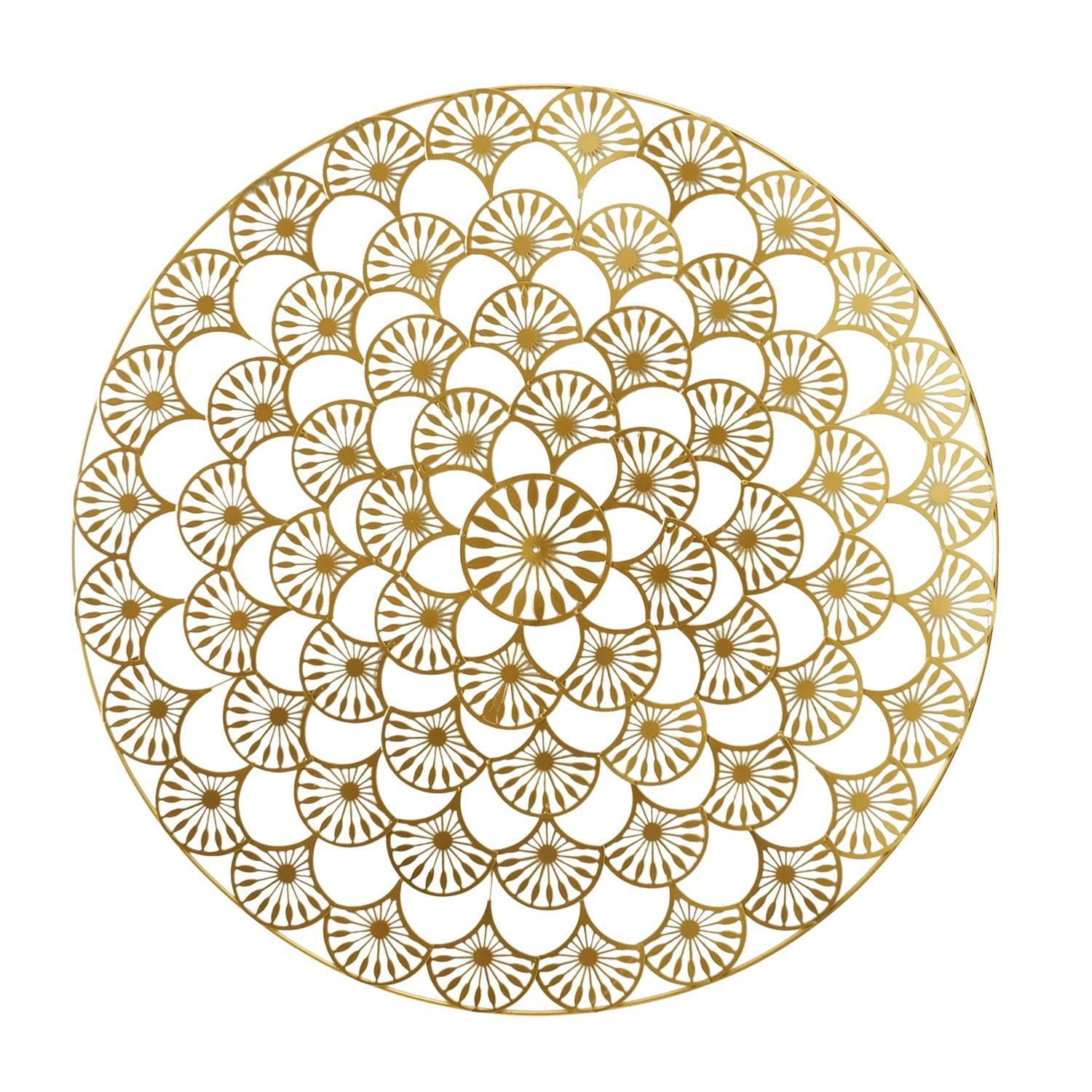 Okrągła, złota ozdoba o średnicy 70cm charakteryzuje się delikatnym, powtarzającym się wzorem, który dzięki ażurowej konstrukcji nie przytłacza.