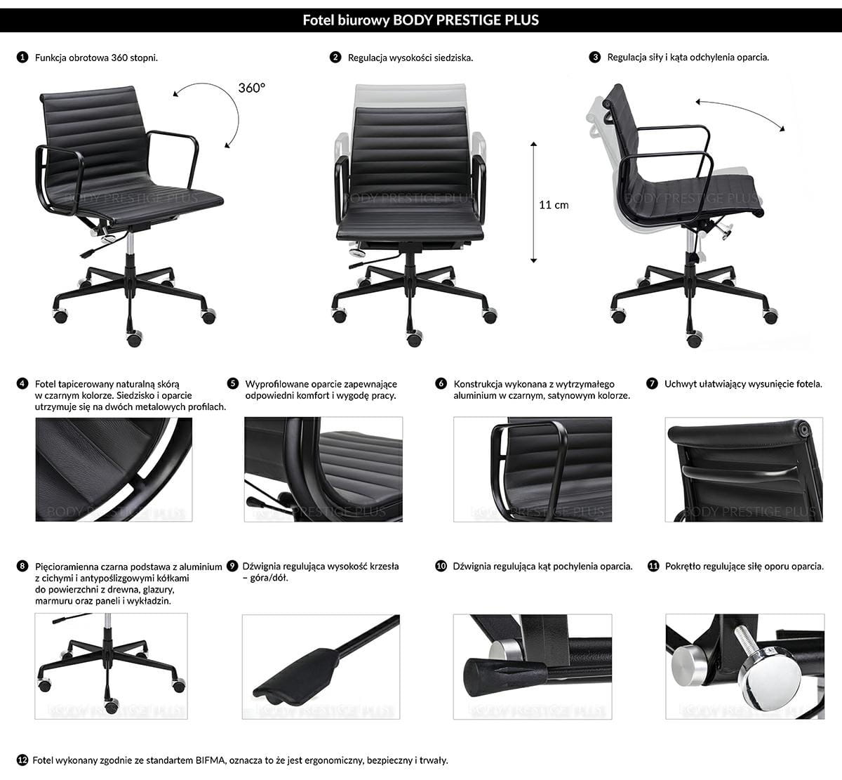 Fotel biurowy BODY PRESTIGE PLUS czarny - skóra naturalna, aluminium 2 to funkcjonalny i estetyczny wybór, który sprawdzi się w różnych wnętrzach. Wyróżnia się solidnym wykonaniem i ponadczasowym charakterem. Będzie idealnym dodatkiem do Twojej przestrzeni.
