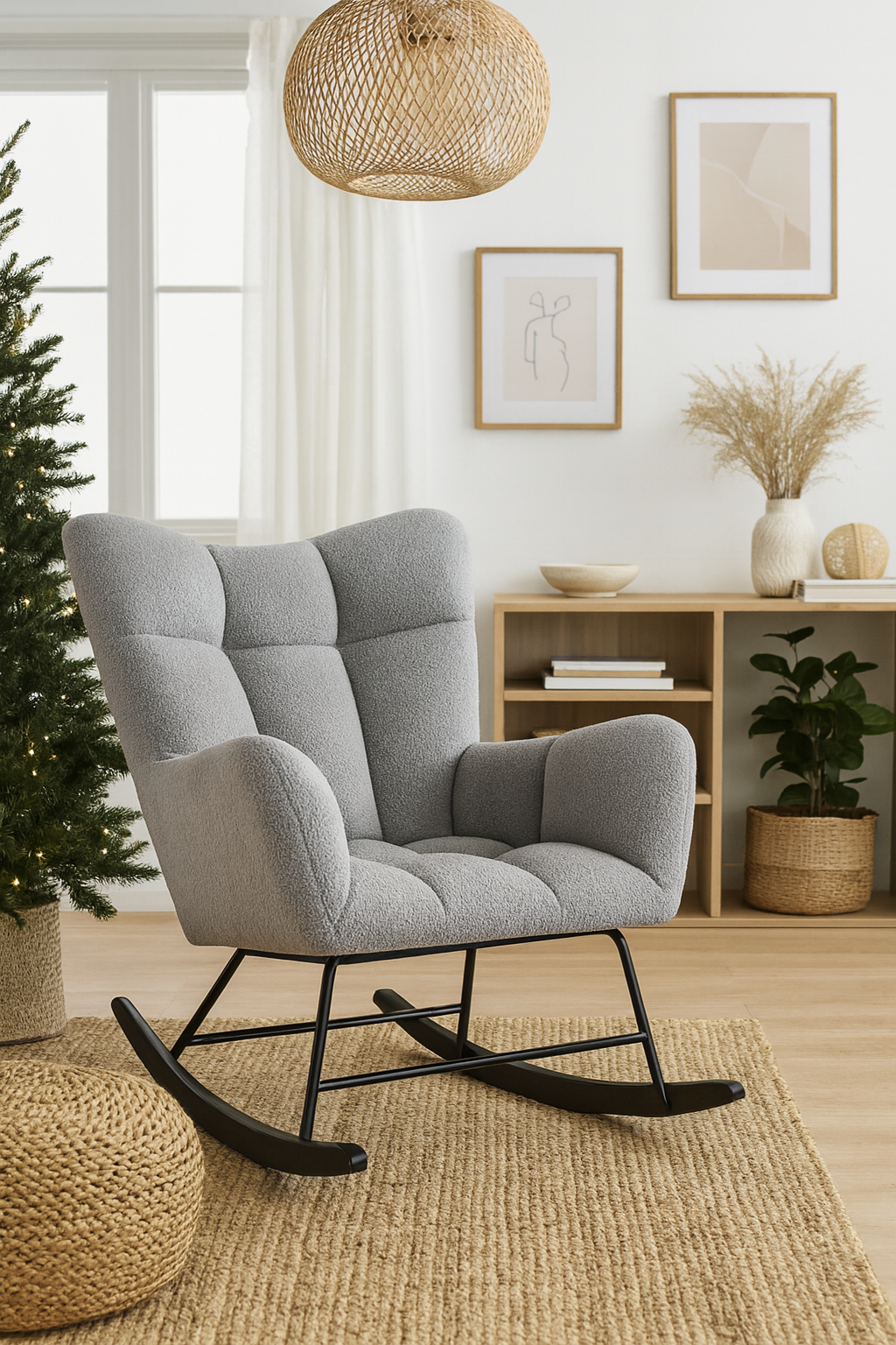 Fotel bujany Teddy to połączenie przytulnego stylu i komfortu z elegancką formą. Miękkie siedzisko pokryte tkaniną Teddy (bouclé) zapewnia wyjątkową wygodę, a jego szara kolorystyka doskonale komponuje się z nowoczesnymi wnętrzami.