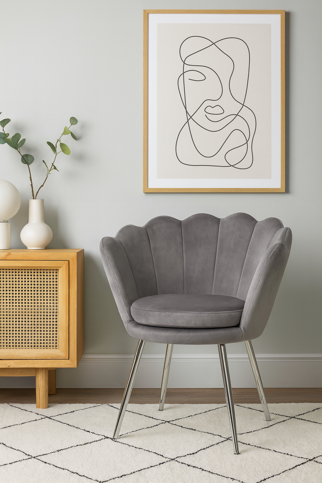 Fotel Shell to elegancki i stylowy mebel, który wyróżnia się charakterystycznym oparciem w kształcie muszli. Tapicerowany miękkim i przyjemnym w dotyku welurem w kolorze szarym, zapewnia komfort oraz wprowadza do wnętrza subtelną nutę luksusu.