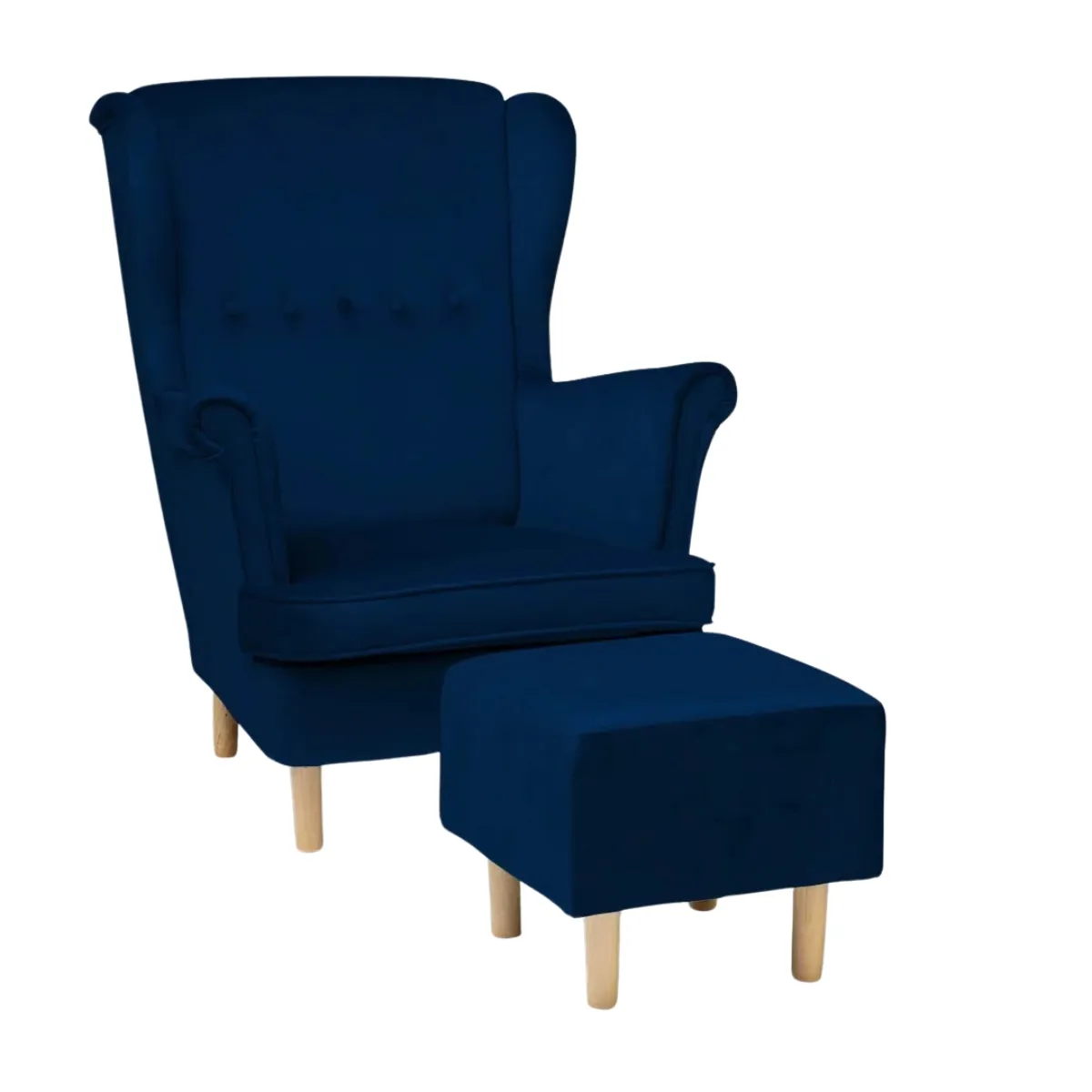 Fotel uszak granatowy z podnóżkiem, na drewnianych nogach do salonu lub sypialni
