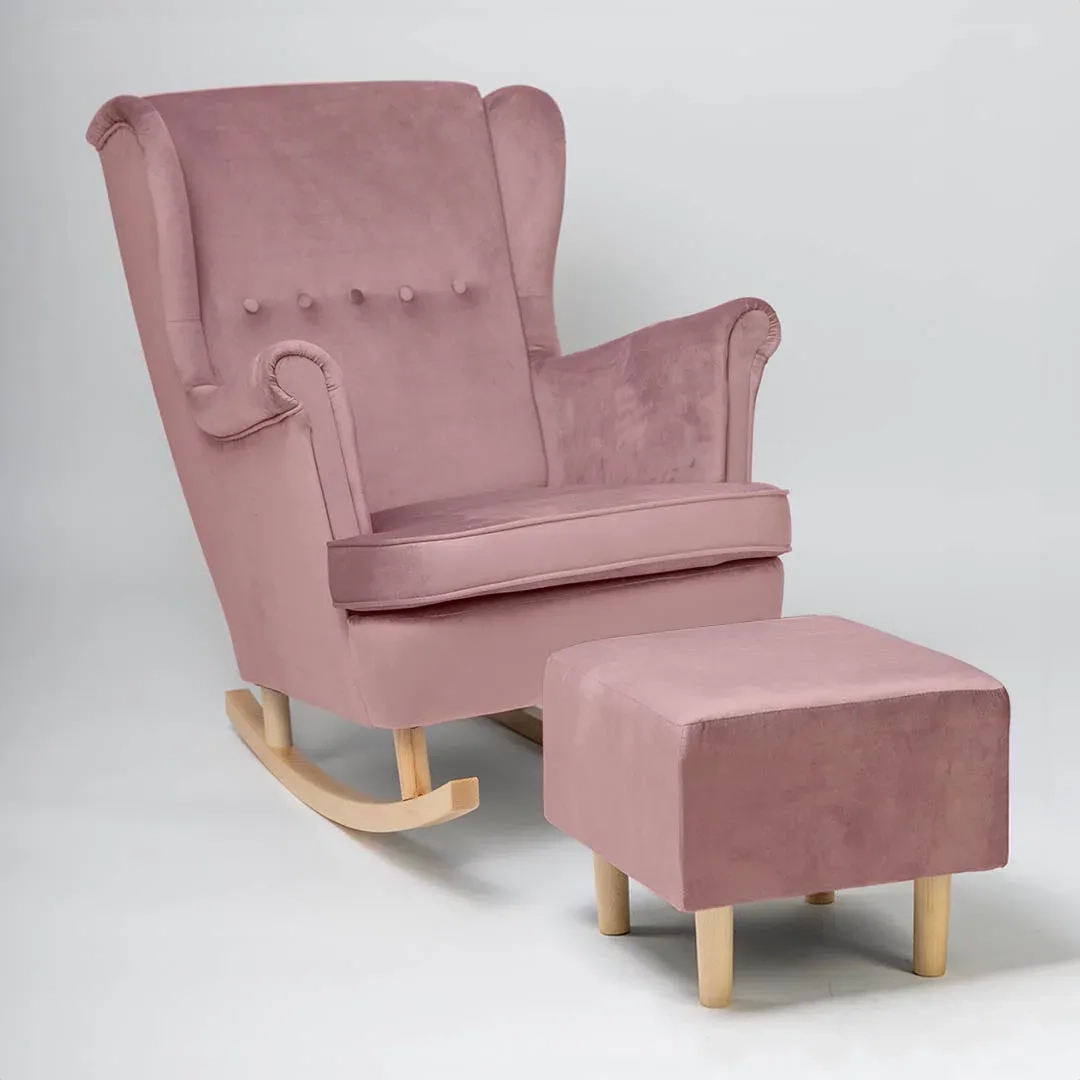 Fotel uszak różowy na drewnianych bujanych nogach, z podnóżkiem do salonu lub sypialni