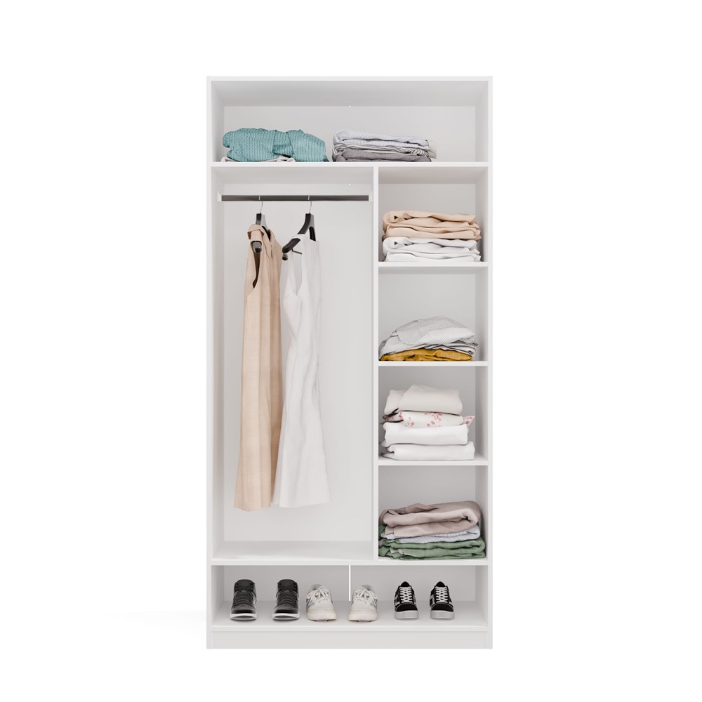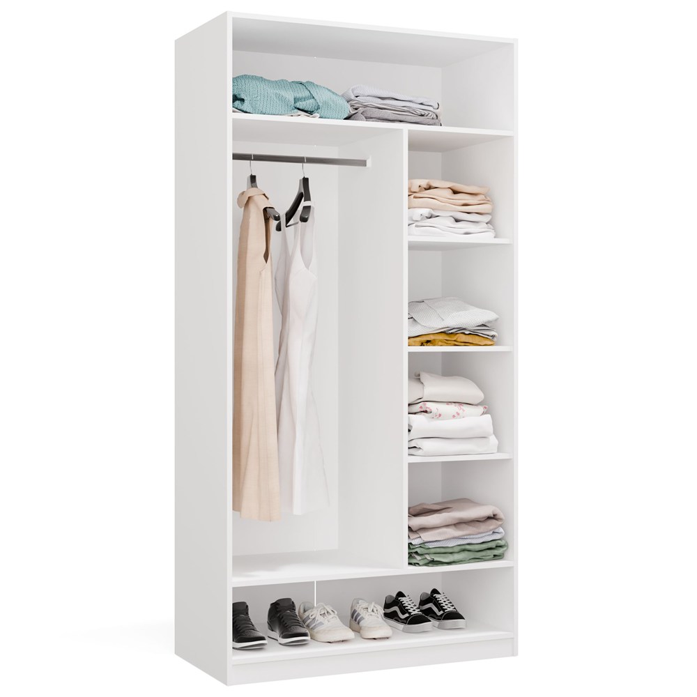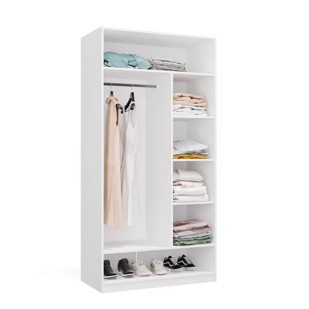 Przemyślany układ wnętrza obejmuje drążek na ubrania oraz 6 praktycznych półek, które pomagają utrzymać porządek i wygodnie przechowywać odzież, dodatki oraz obuwie.