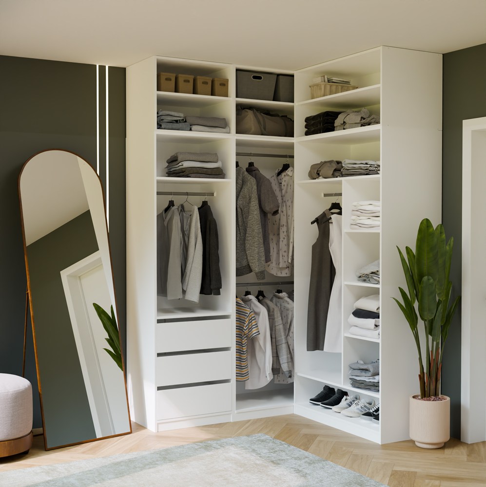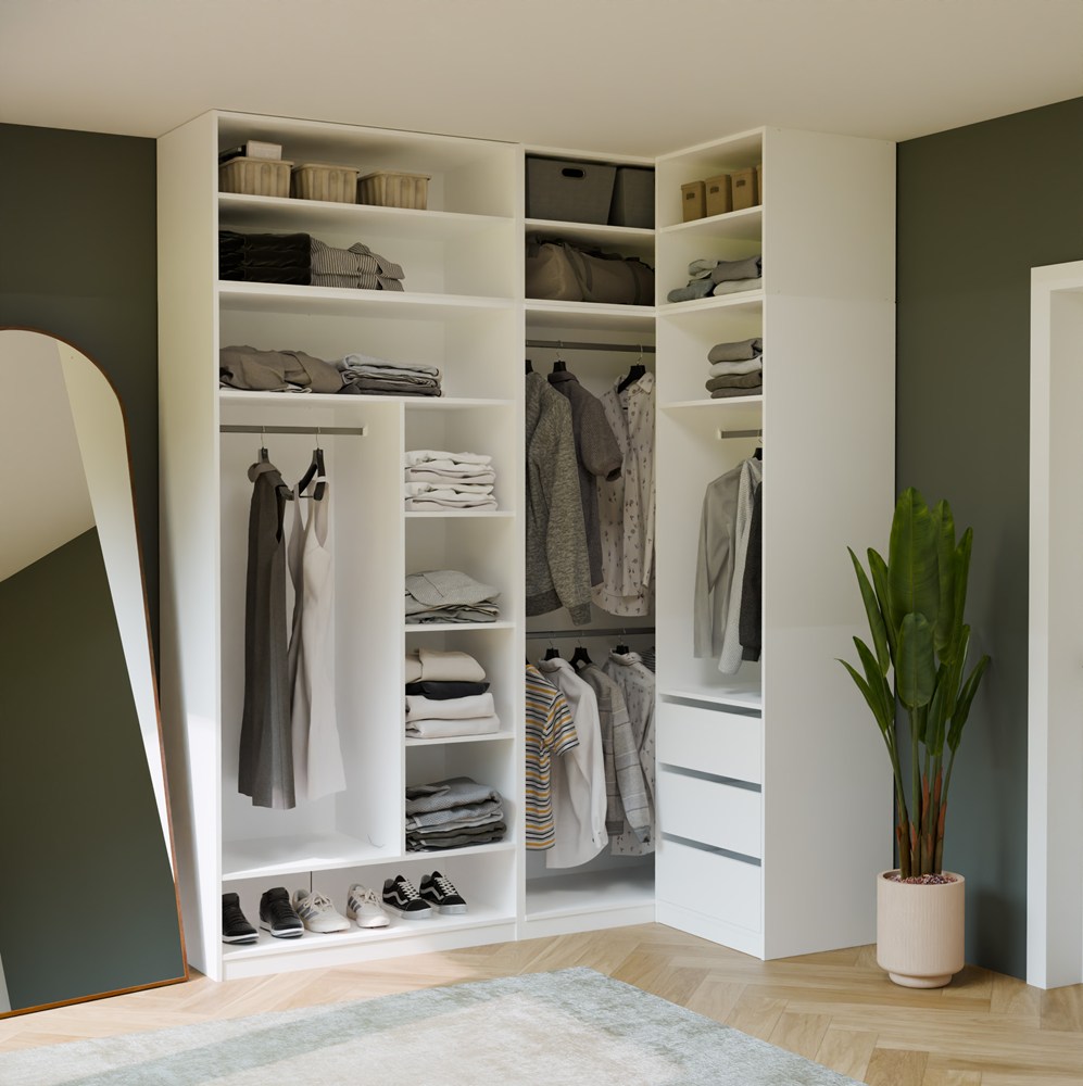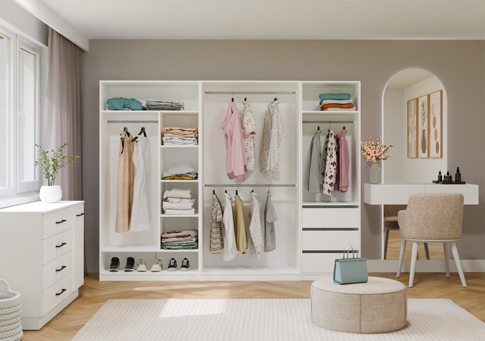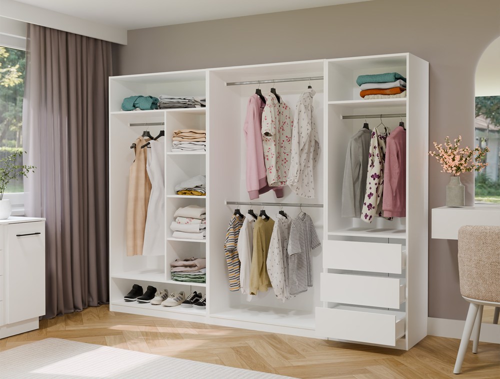 W zależności od potrzeb możesz rozbudować zestaw o kolejne moduły z wieszakami, szufladami, półkami lub dodatkowymi nadstawkami.