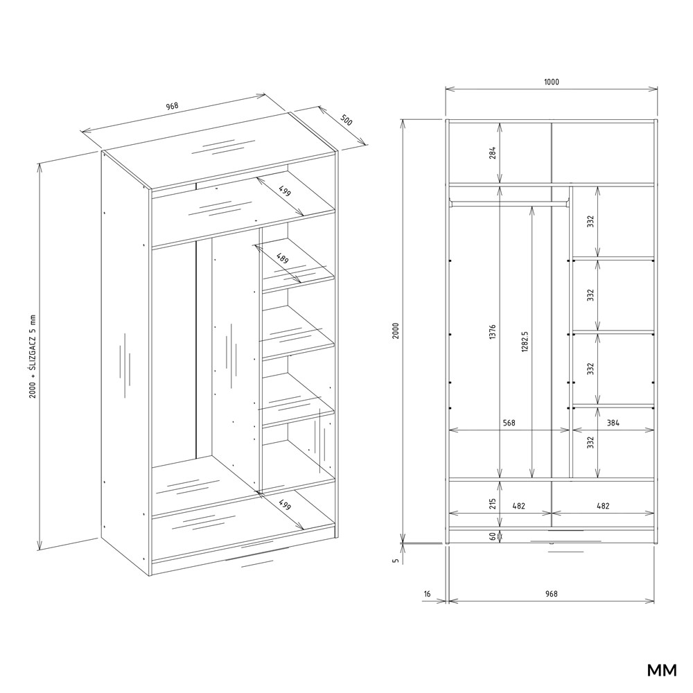 - Drążek na ubrania – idealny do przechowywania koszul, marynarek, sukienek i innych elementów garderoby wymagających zawieszenia