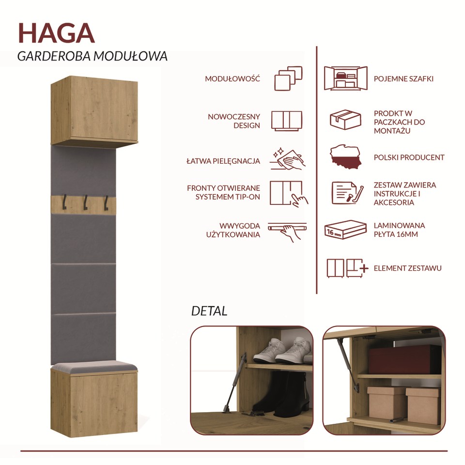 - Modułowa seria HAGA – możliwość łączenia z innymi meblami z tej kolekcji i stworzenia własnego układu garderoby