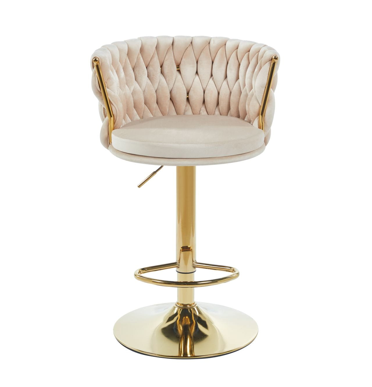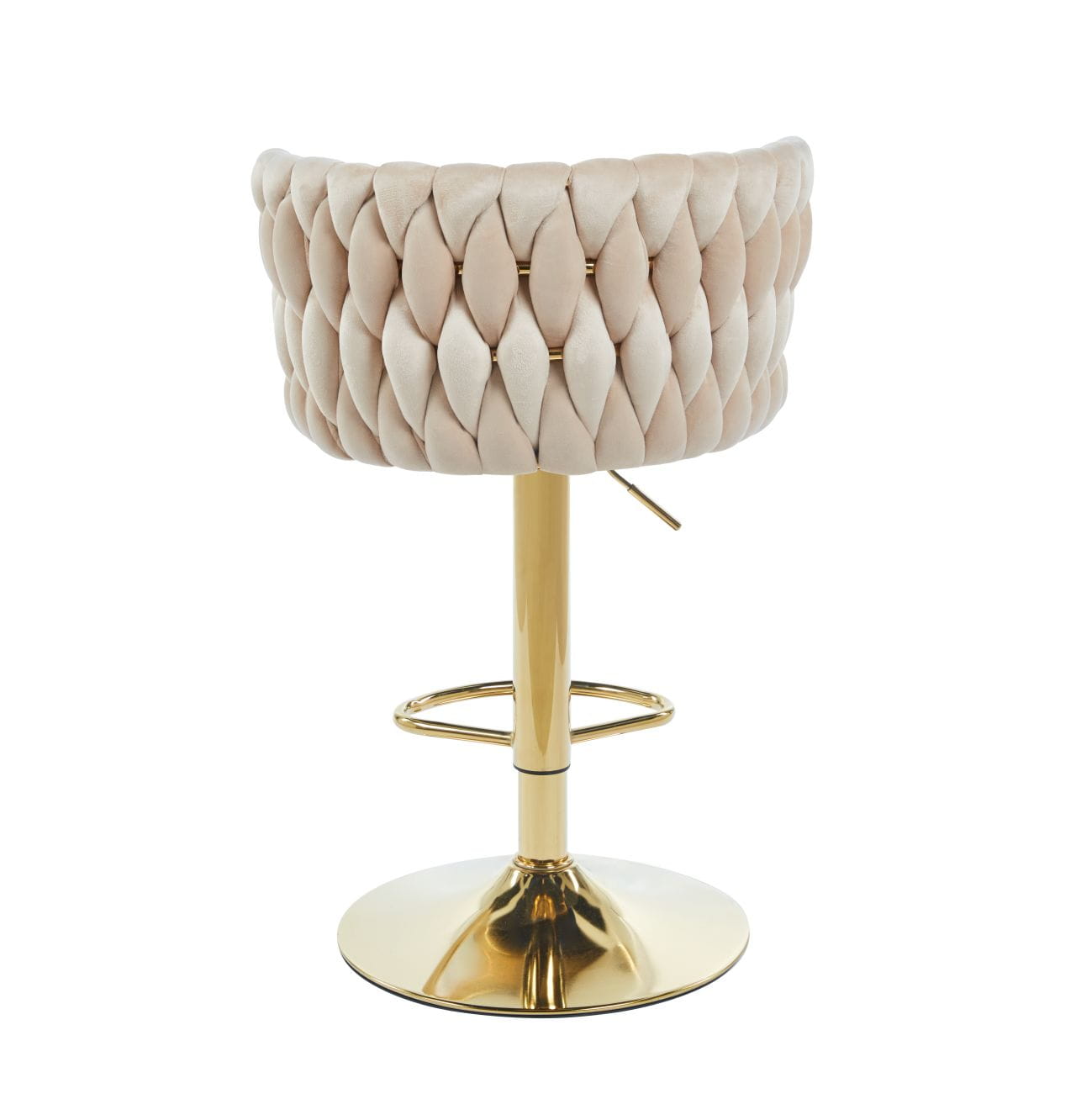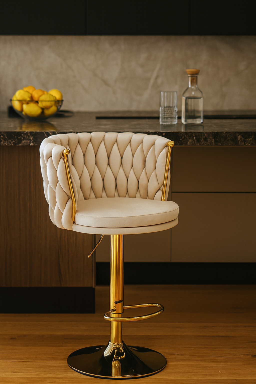 Stabilny stelaż w złotym, chromowanym wykończeniu podkreśla luksusowy charakter hokera, a możliwość regulacji wysokości pozwala dopasować go do różnych blatów i indywidualnych potrzeb użytkownika. Dodatkowy podnóżek zwiększa komfort codziennego użytkowania.