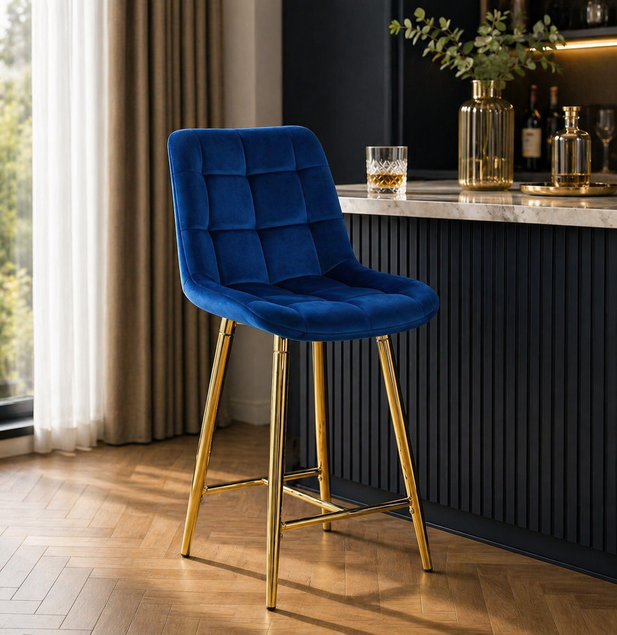 Hoker welurowy ARIA w kolorze niebieskim to eleganckie krzesło barowe stworzone z myślą o nowoczesnych kuchniach, jadalniach i strefach przy wyspie.