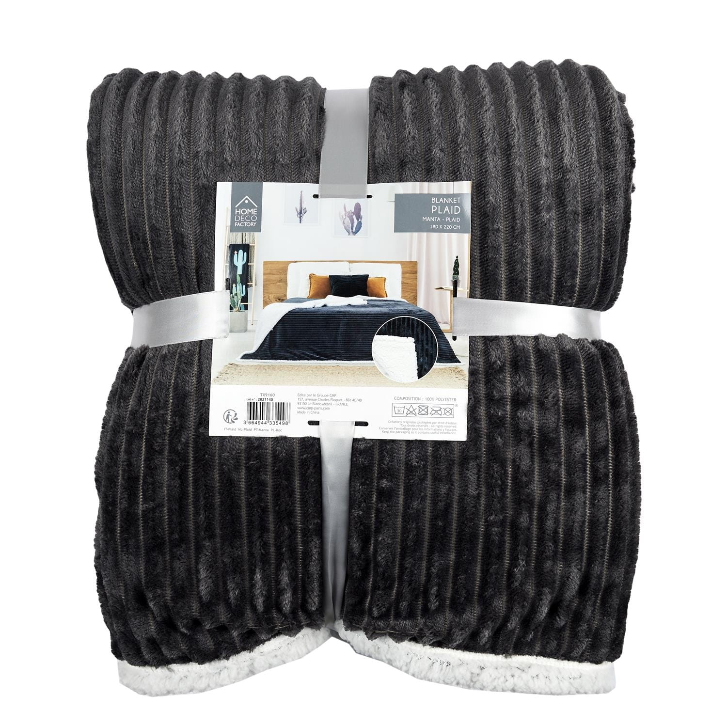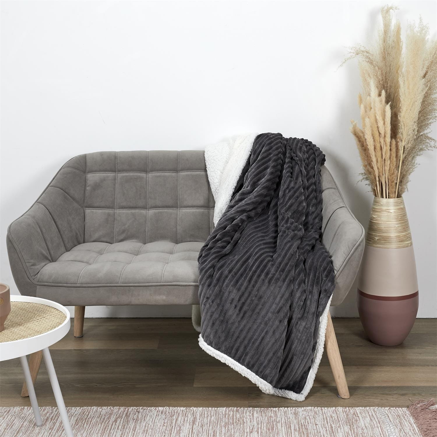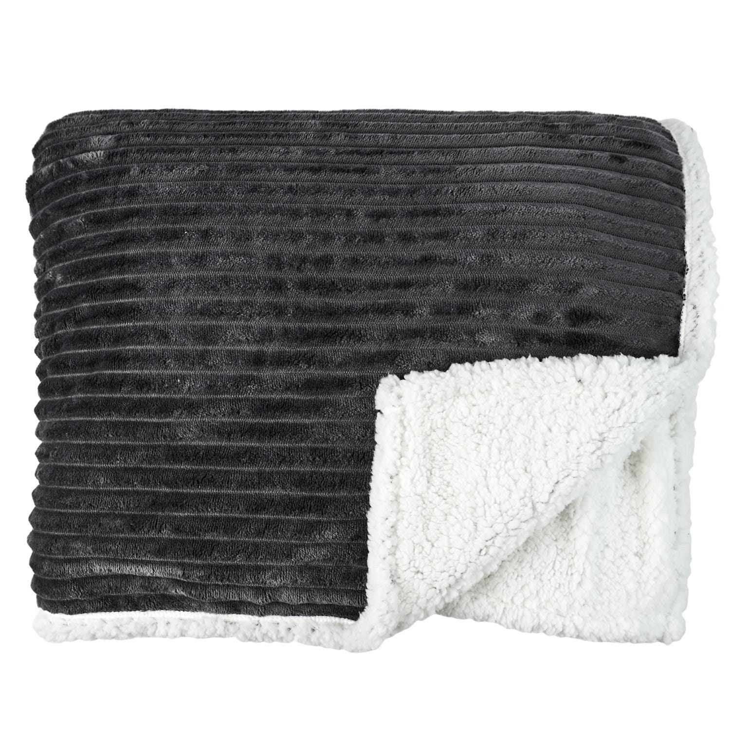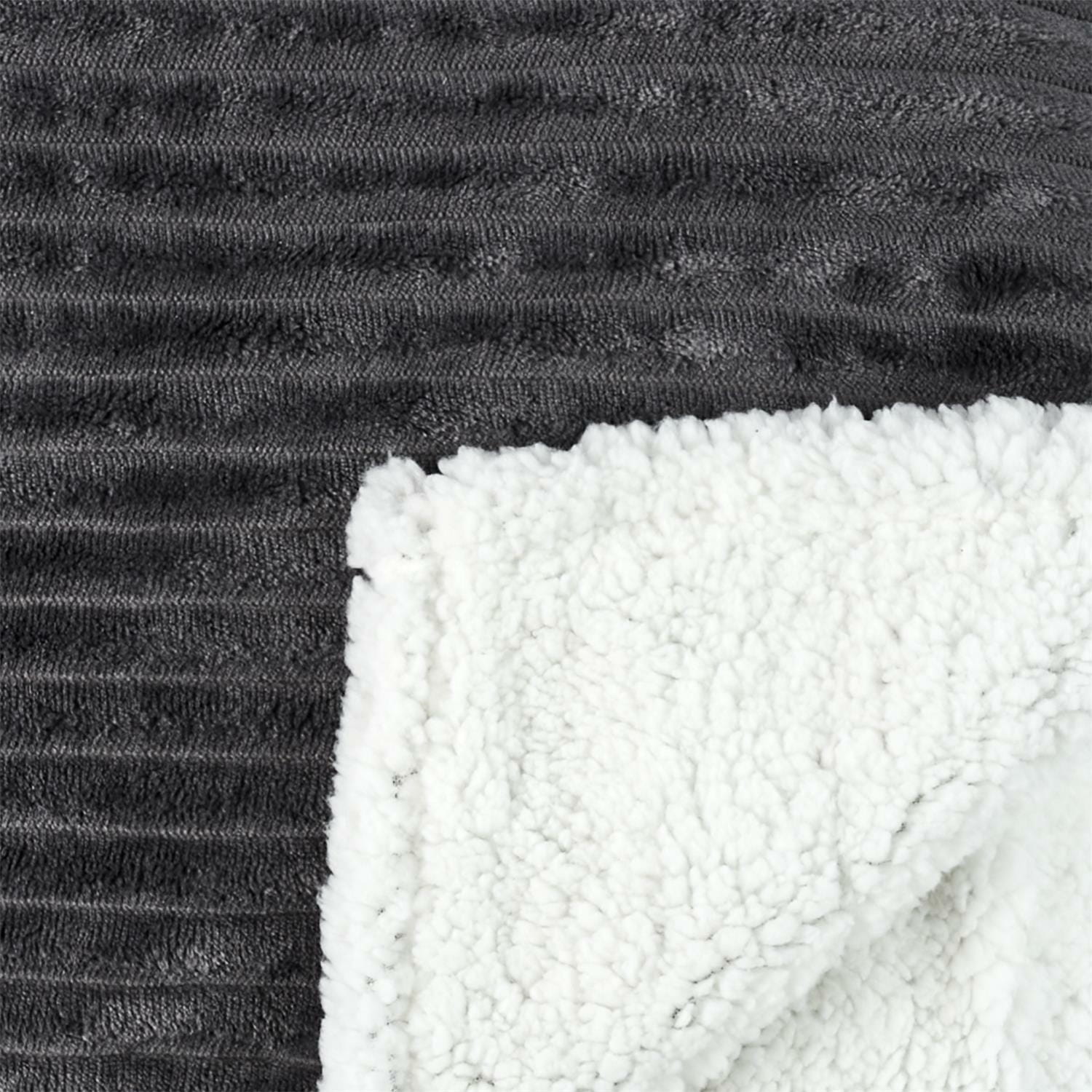 Wyjątkowo gruby koc Sherpa wykonany z miękkiej, prążkowanej tkaniny w kolorze szarym, a od spodu obszyty białą, pluszową tkaniną, która zapewnia niezrównaną miękkość i ciepło.