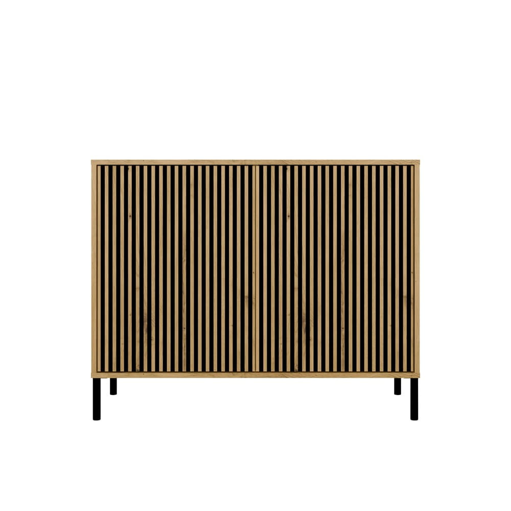 Komoda KAMARO 2D SLIM dąb artisan to połączenie estetyki i funkcjonalności, które sprawdzi się w salonie, sypialni, pokoju gościnnym czy domowym biurze. Jej nowoczesna forma została wzbogacona o ryflowane fronty drzwi przypominające lamele, które nadają całości oryginalnego, przestrzennego charakteru.