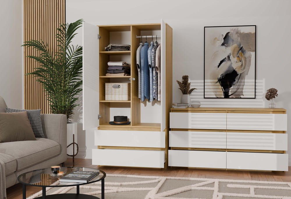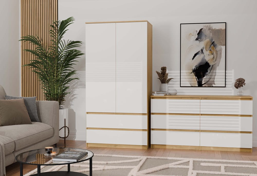 Połączenie korpusu w dekorze dąb artisan z białymi frontami rozjaśnia wnętrze i pasuje do wielu aranżacji.