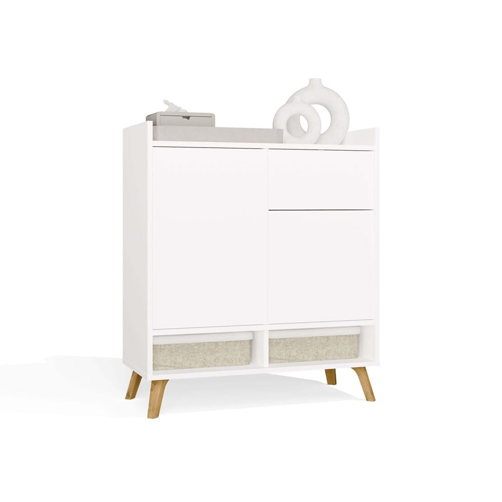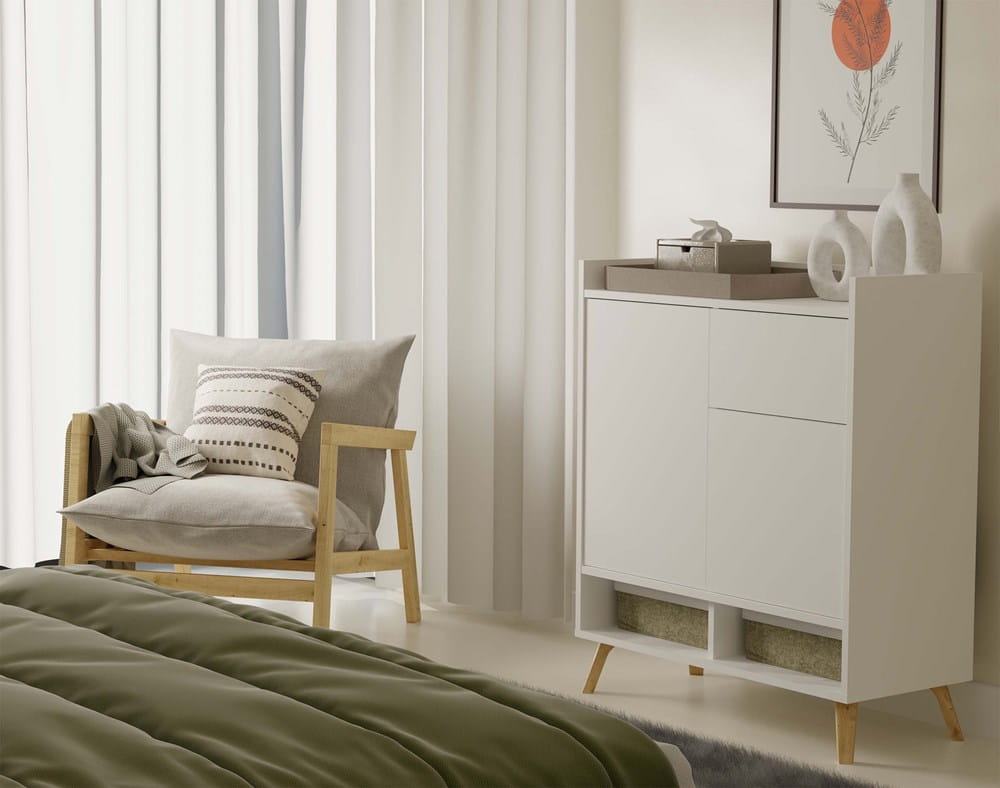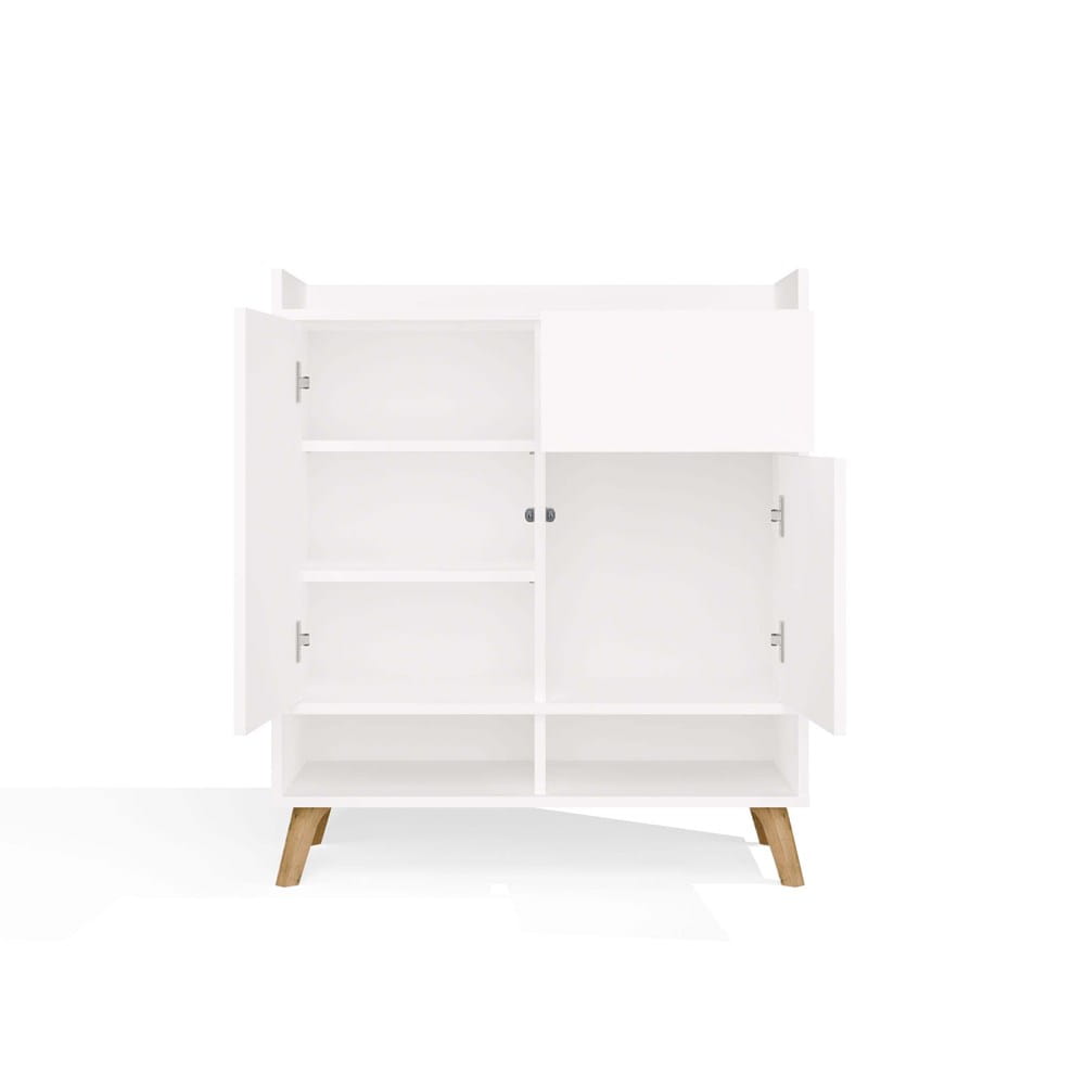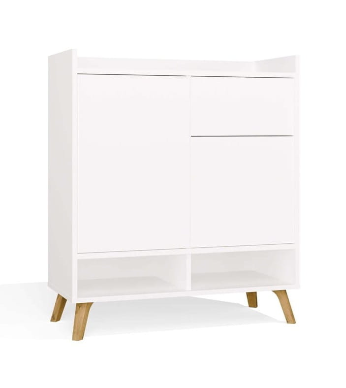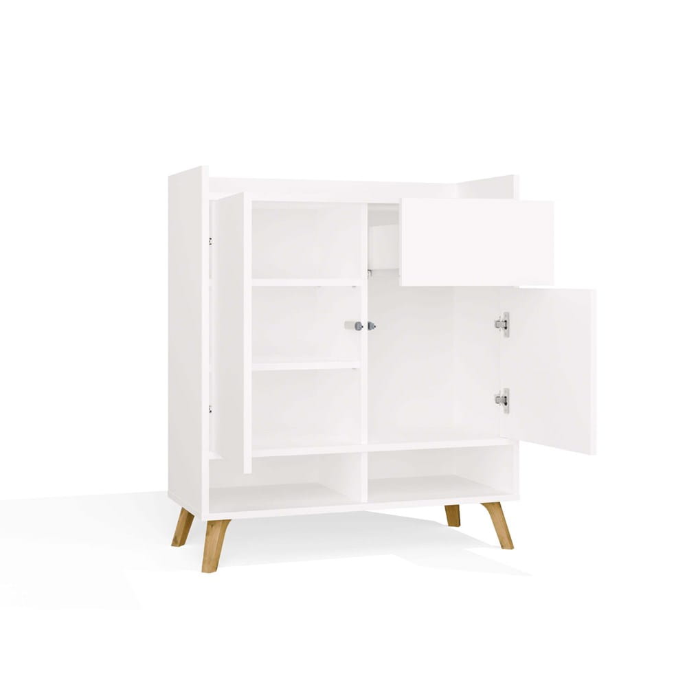Komoda COLIN to elegancki i nowoczesny mebel, który doskonale odnajdzie się w salonie, sypialni czy pokoju dziecięcym. Połączenie matowej bieli z ciepłym dekorem dąb artisan na wysokich, drewnianych nogach nadaje jej lekkości oraz skandynawskiego charakteru.
