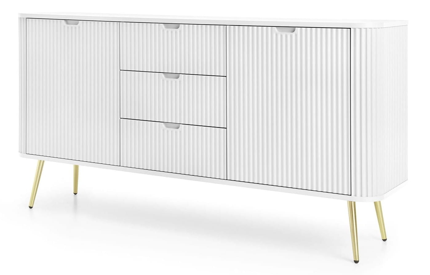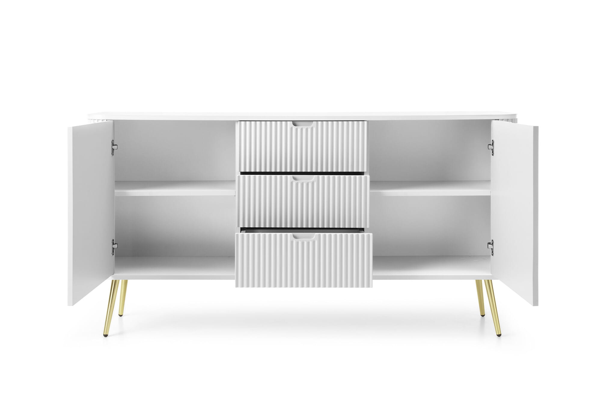 Elegancki design komody podkreślają subtelne ryflowania na frontach i korpusie, nadając jej dekoracyjny, luksusowy charakter.