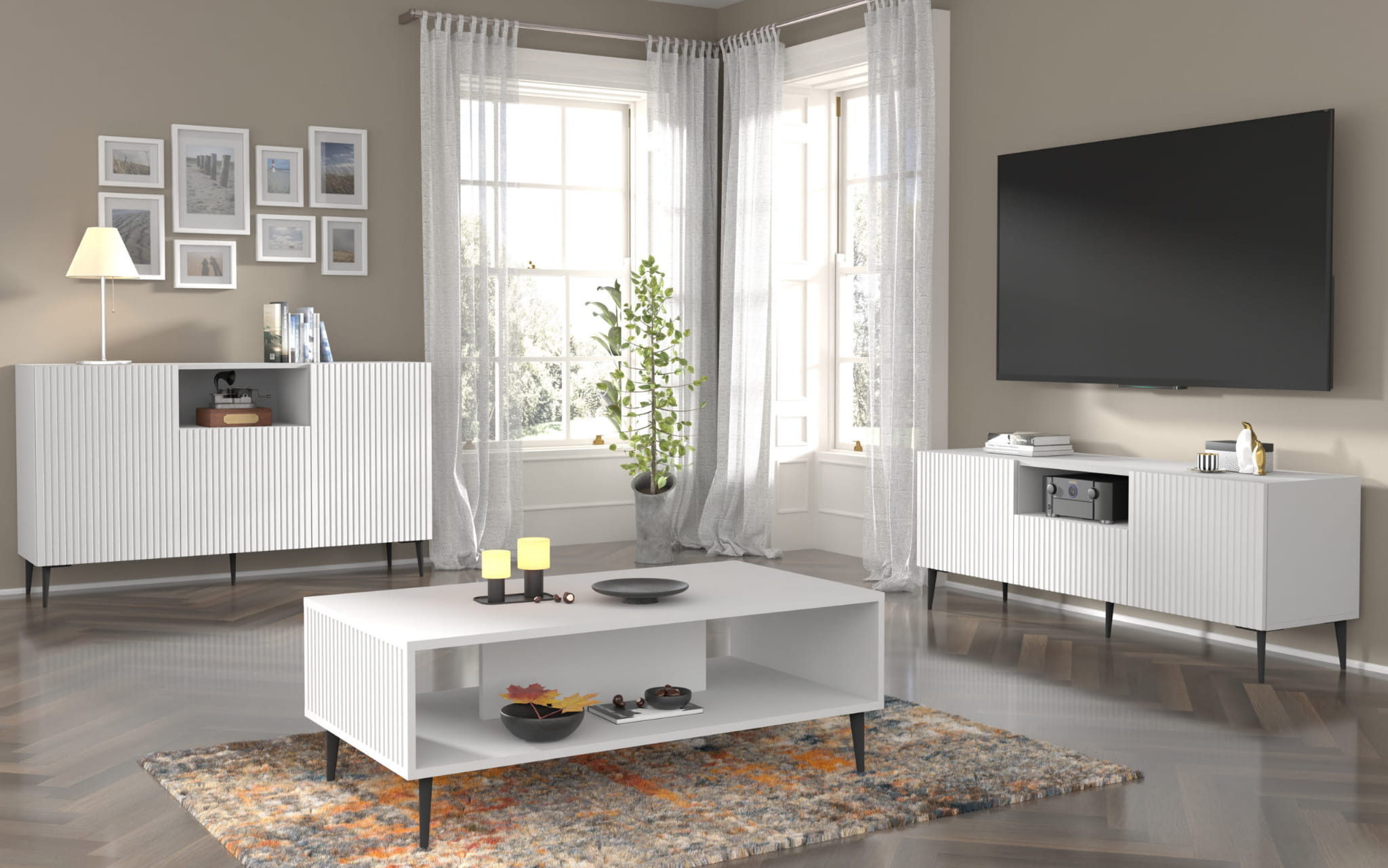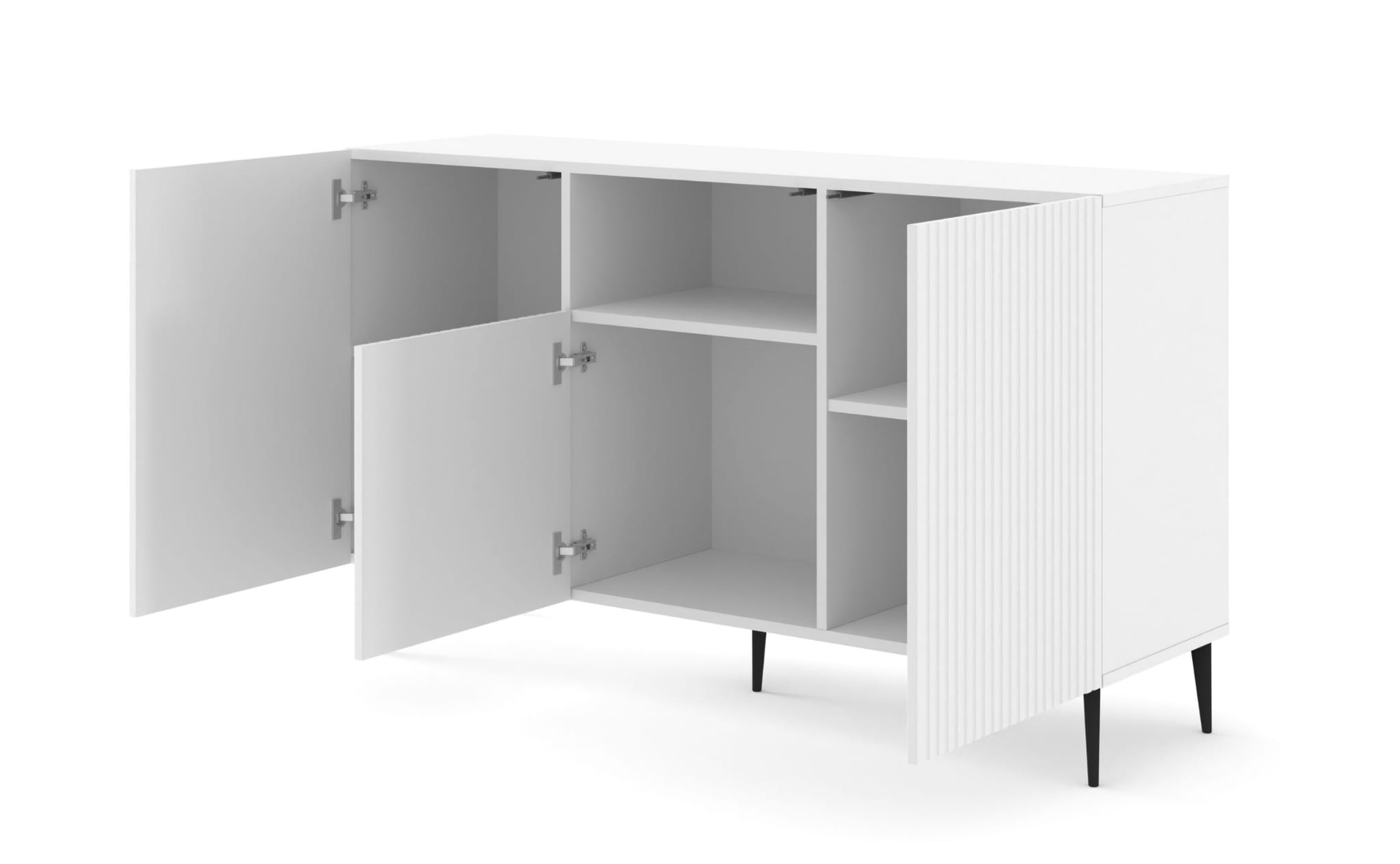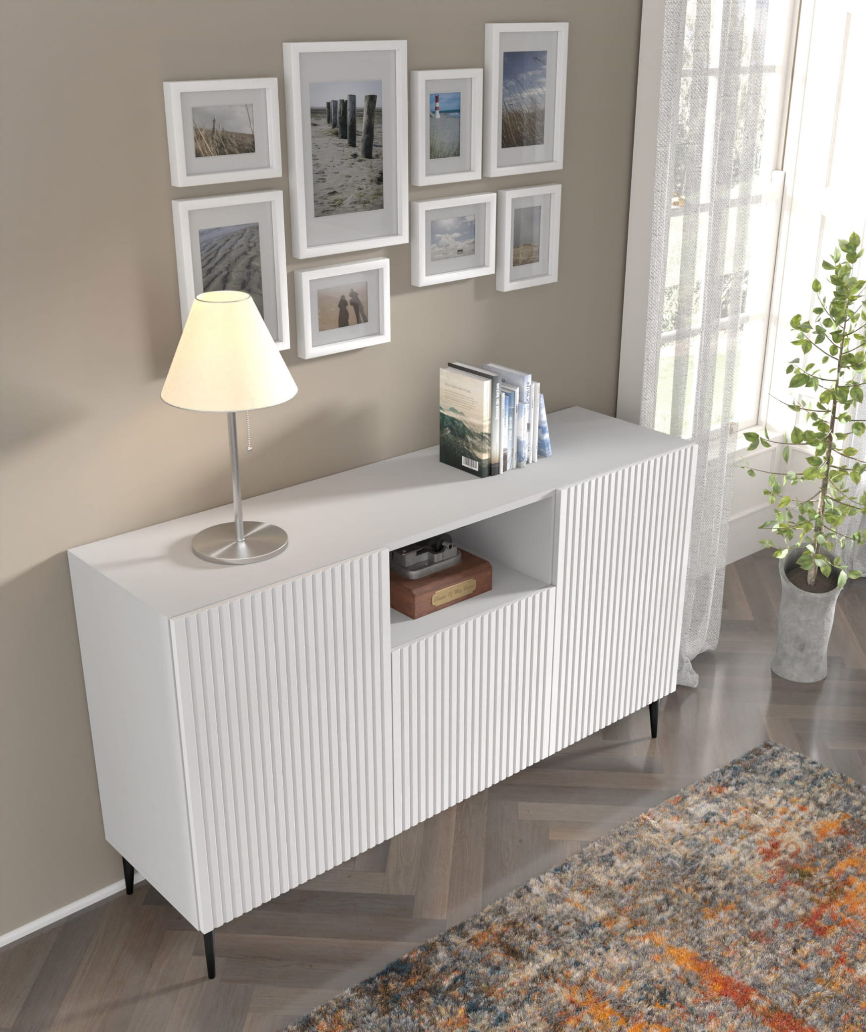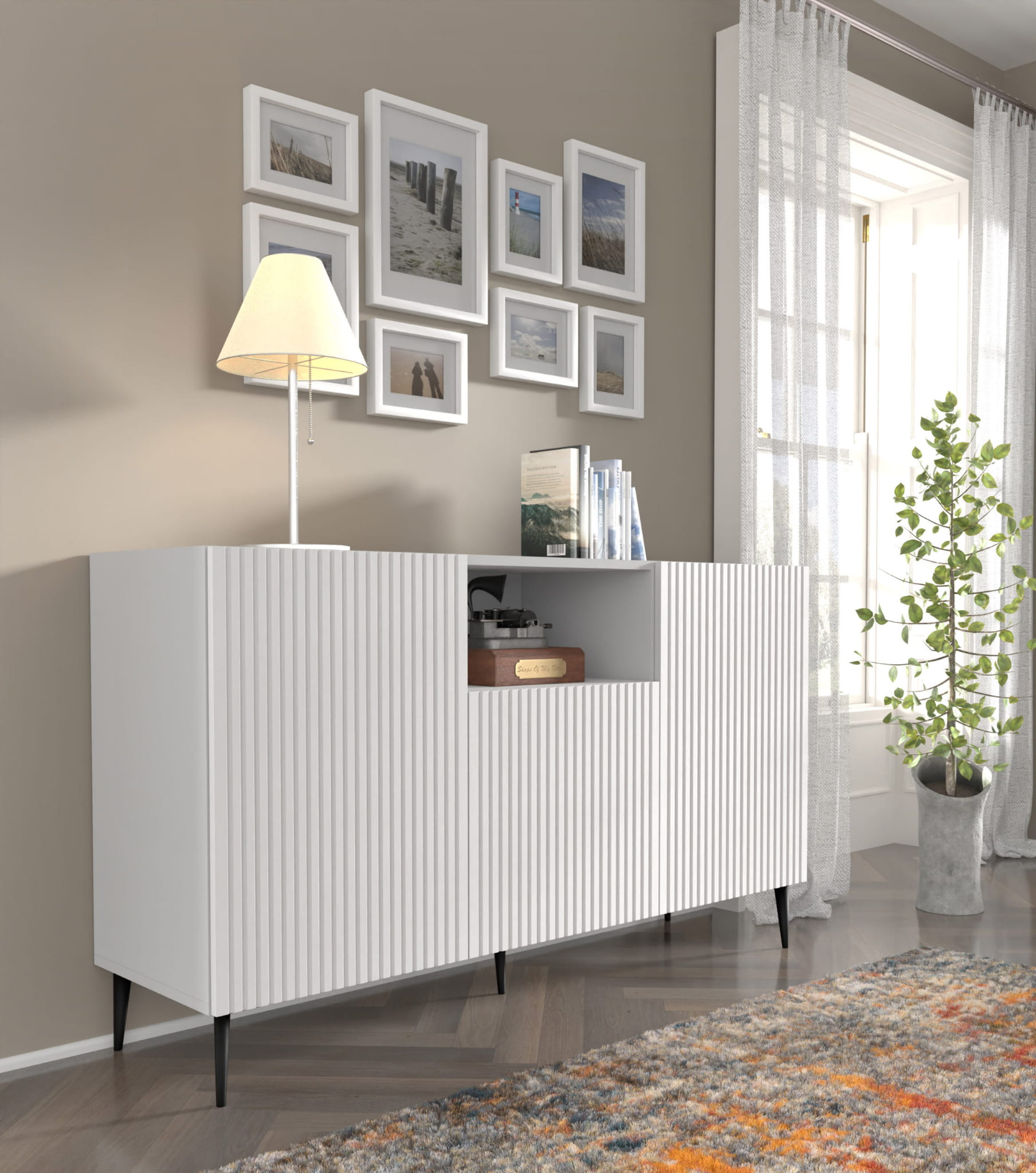 Komoda Ravenna z 3 szafkami i otwartą półką, frezowane fronty, system push to open