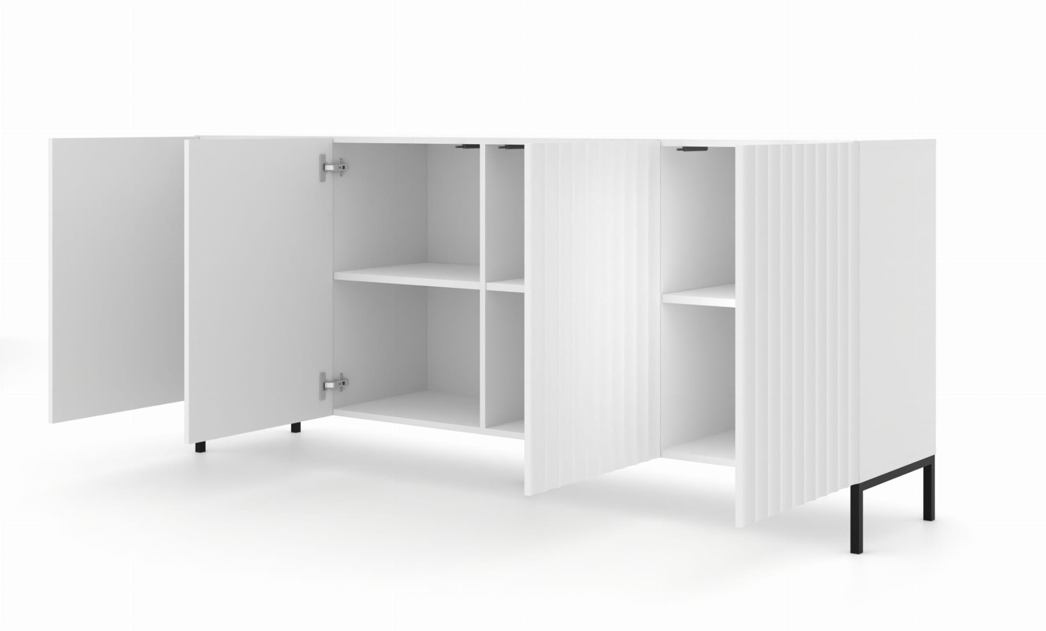 Komoda biała matowa 200 cm, do salonu z frezowanym frontem, z czarnymi nogami Wave 4D