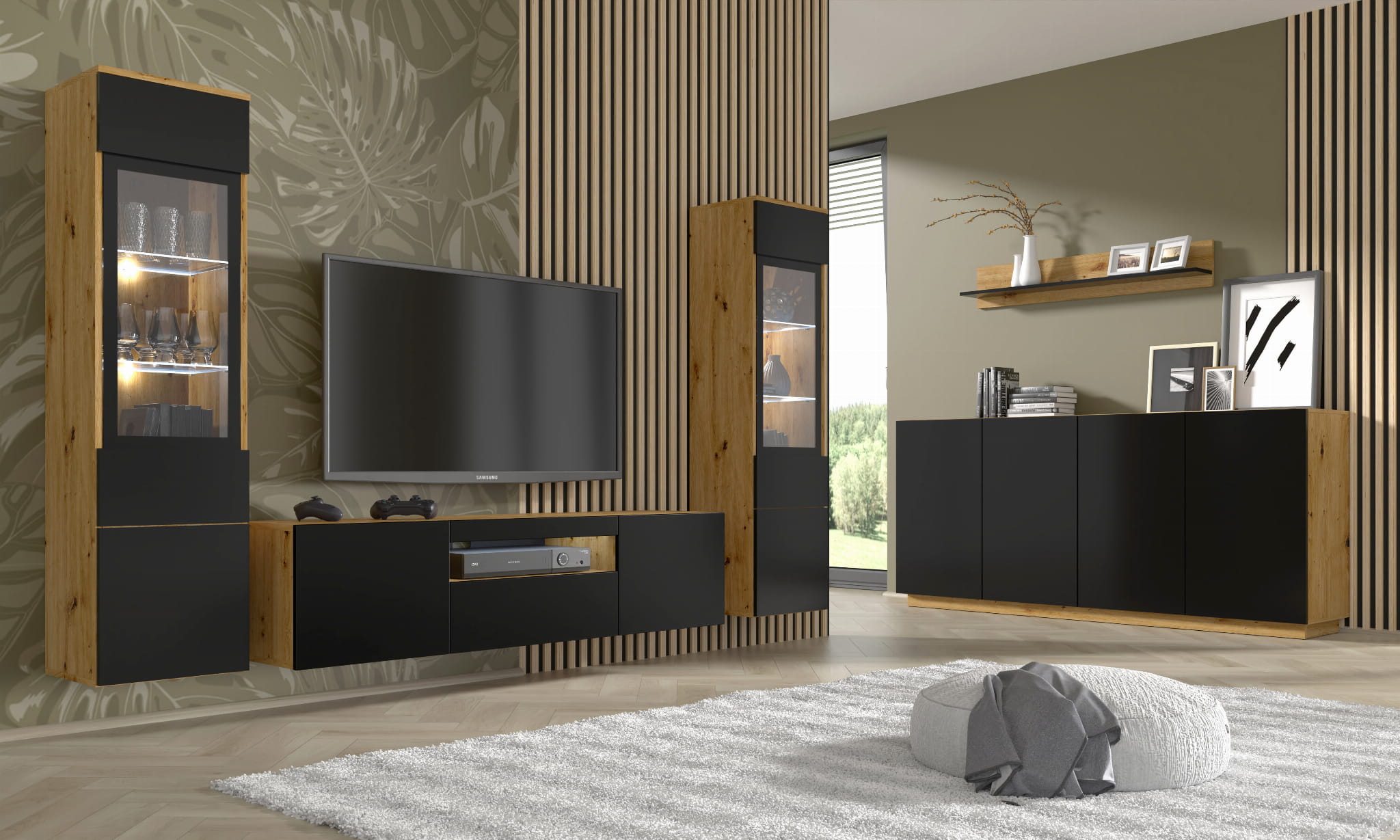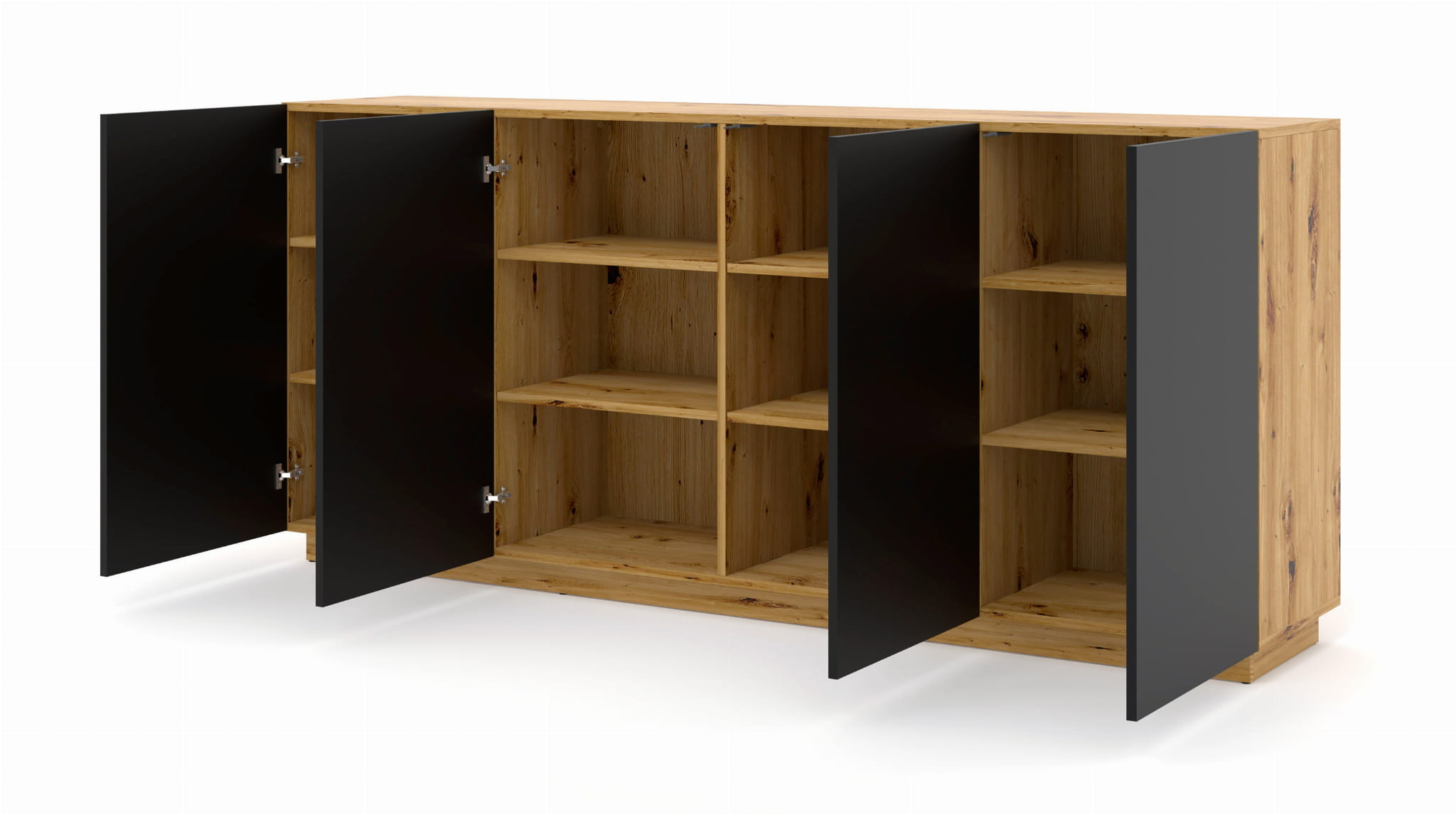 Komoda czterodzwiowa 198 cm, czarna matowa/dąb artisan do salonu Aura 4D