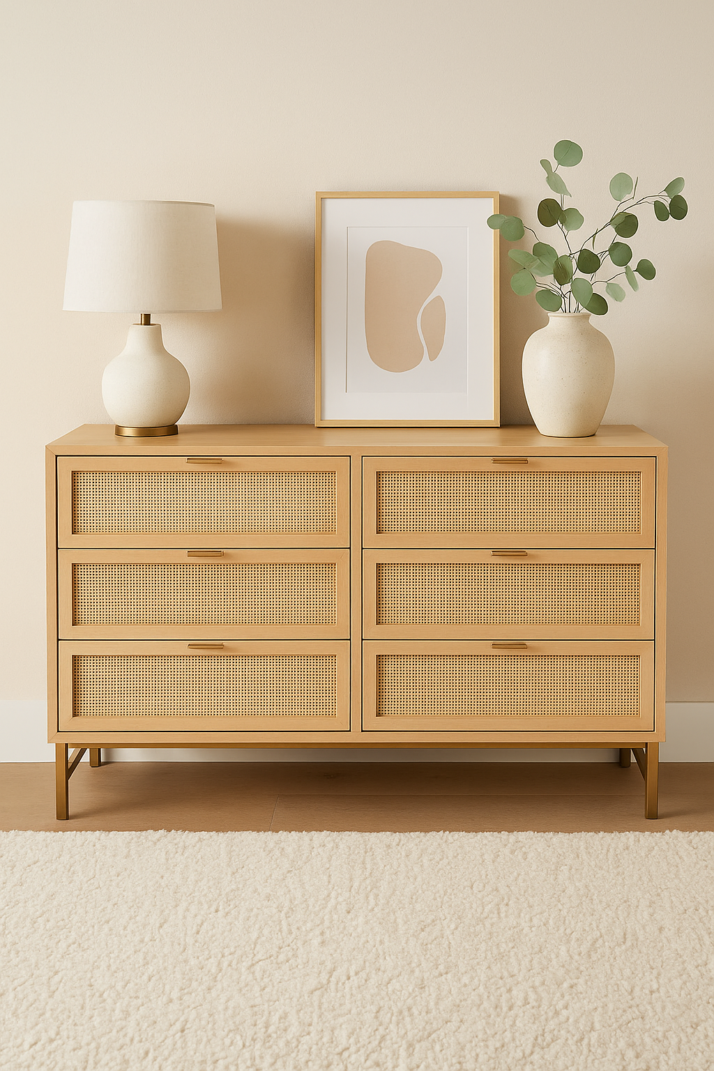 Fronty z plecionki rattanowej nadają komodzie lekkości i egzotycznego klimatu, doskonale komponując się z wnętrzami w stylu boho, skandynawskim czy rustykalnym.