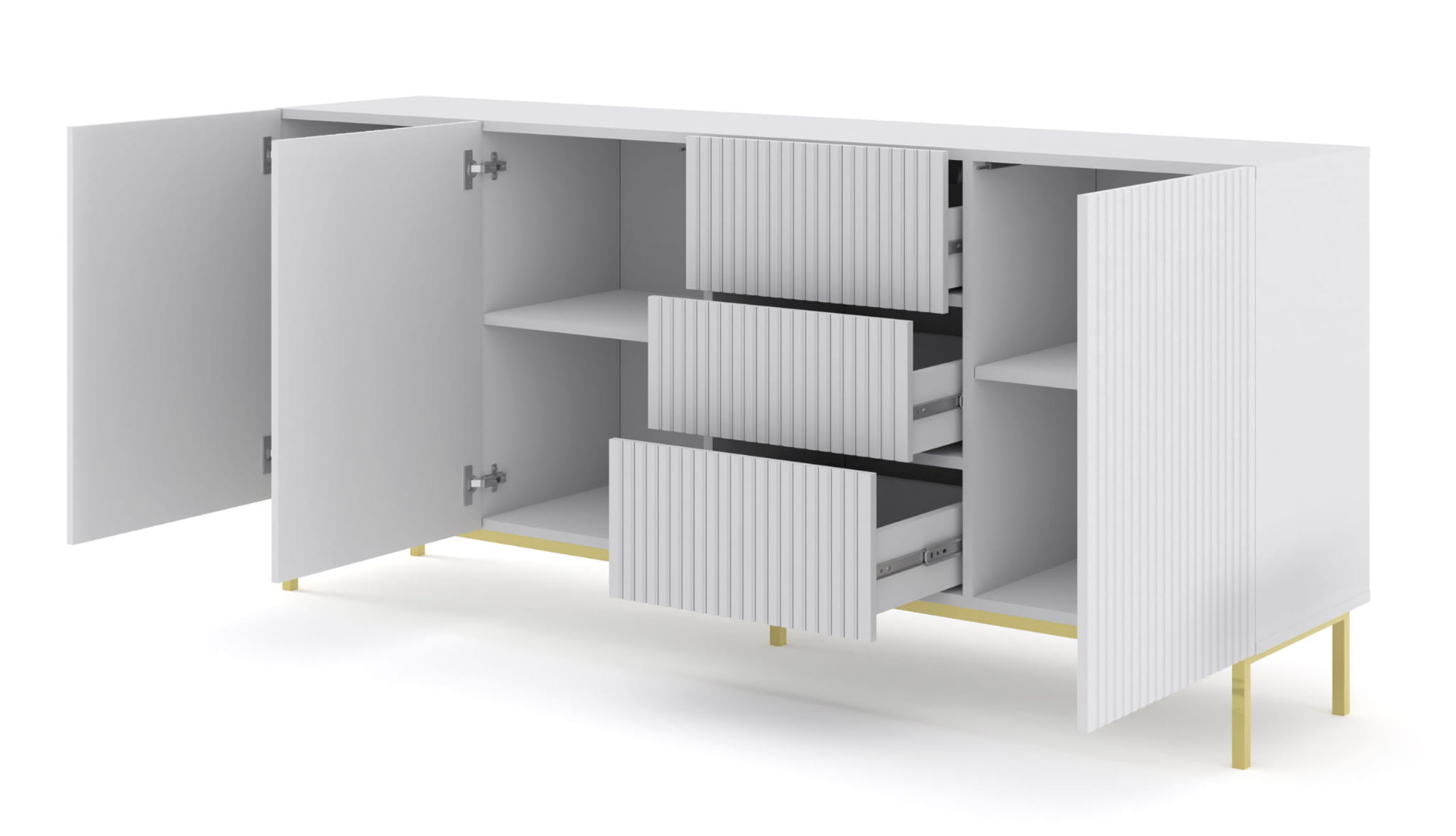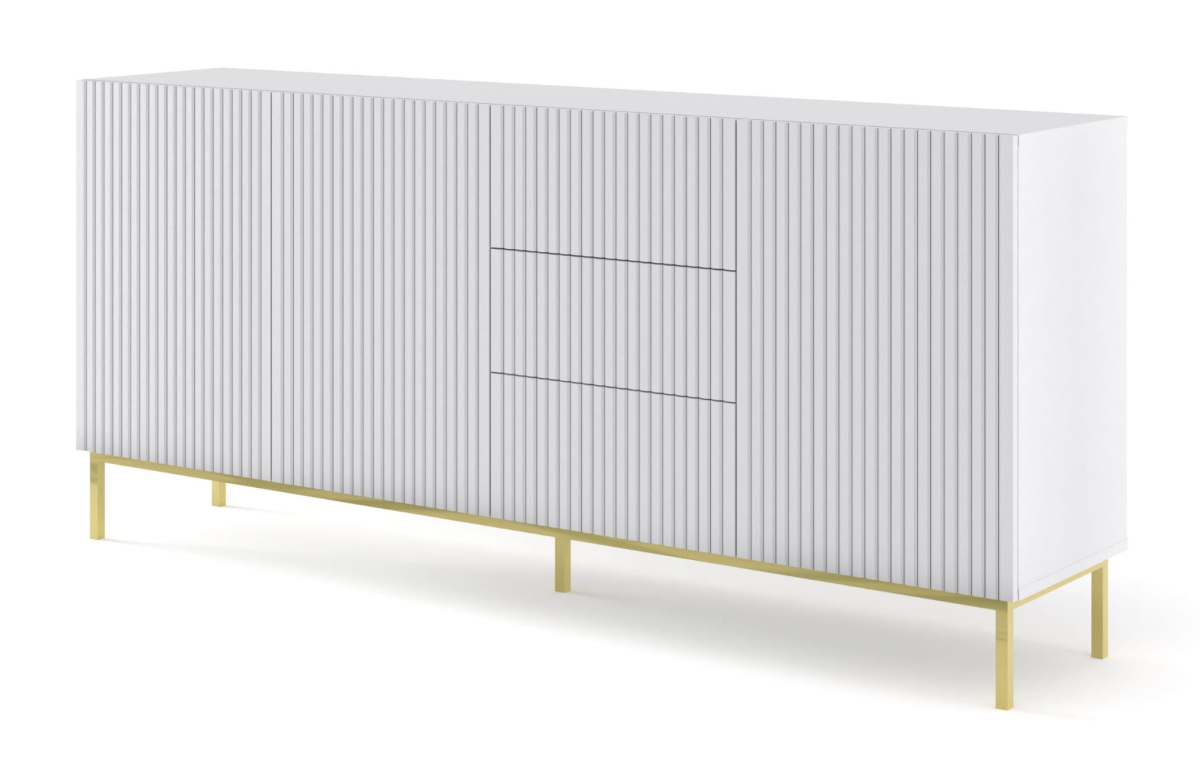 Komoda z białym frezowanym frontem 200 cm, na złotej ramie do salonu Ravenna B 3D3S to funkcjonalny i estetyczny wybór, który sprawdzi się w różnych wnętrzach. Wyróżnia się solidnym wykonaniem i ponadczasowym charakterem. Będzie idealnym dodatkiem do Twojej przestrzeni.
